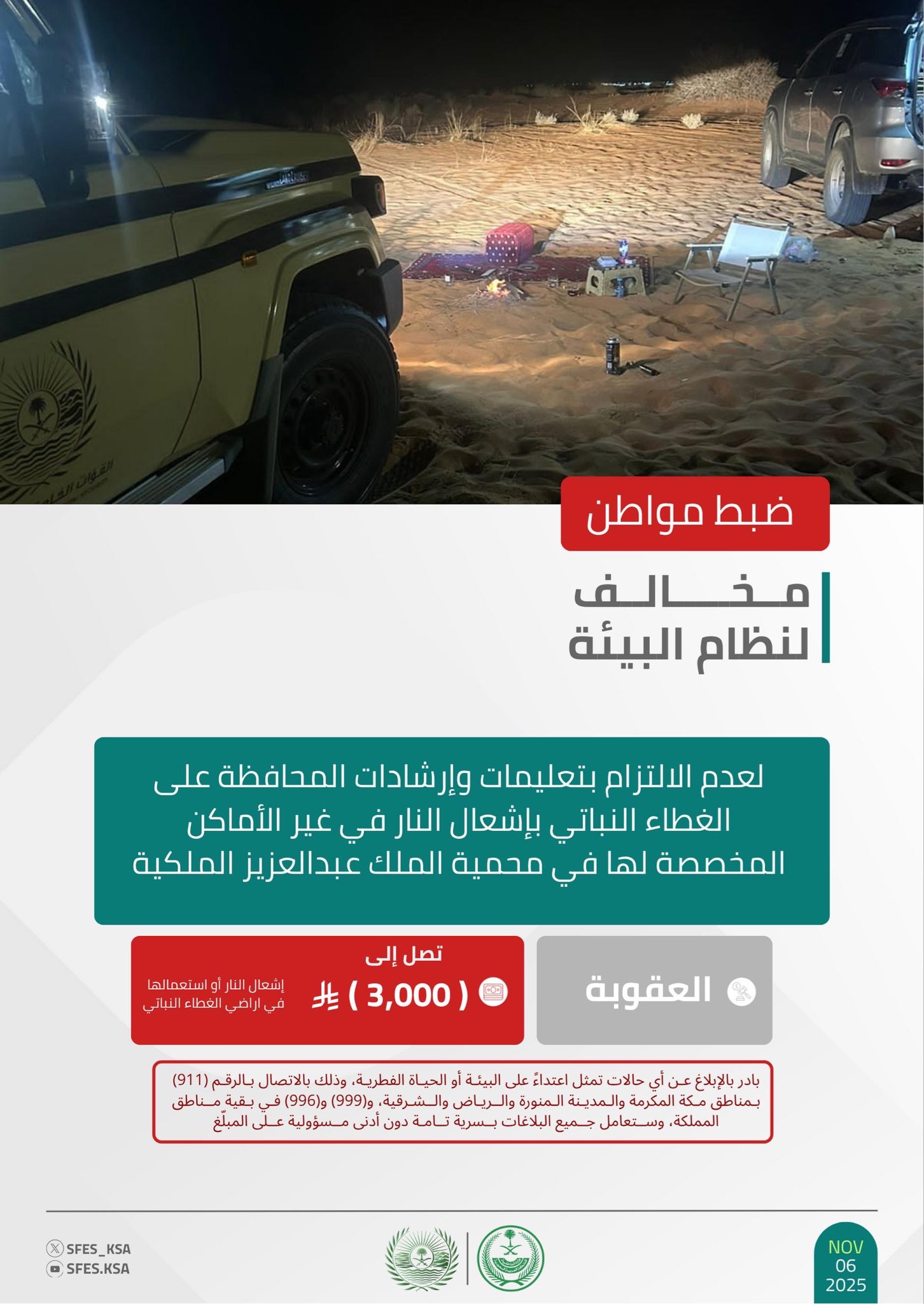 كما ضبطت القوات الخاصة للأمن البيئي مواطنًا مخالفًا لنظام البيئة، لعدم الالتزام بتعليمات وإرشادات المحافظة على الغطاء النباتي بإشعال النار في غير الأماكن المخصصة لها في محمية الملك عبدالعزيز الملكية، وتم تطبيق الإجراءات النظامية بحقه.