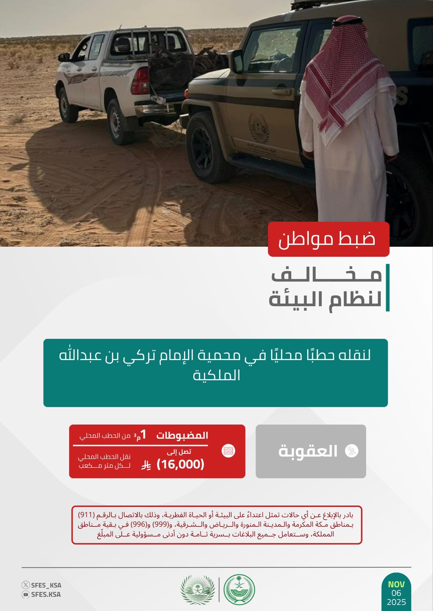 تمكنت القوات الخاصة للأمن البيئي من ضبط مواطن مخالف لنظام البيئة، لنقله مترًا مكعبًا من الحطب المحلي في محمية الإمام تركي بن عبدالله الملكية، وتم تطبيق الإجراءات النظامية بحقه، وتسليم الكميات المضبوطة للجهة المختصة.
