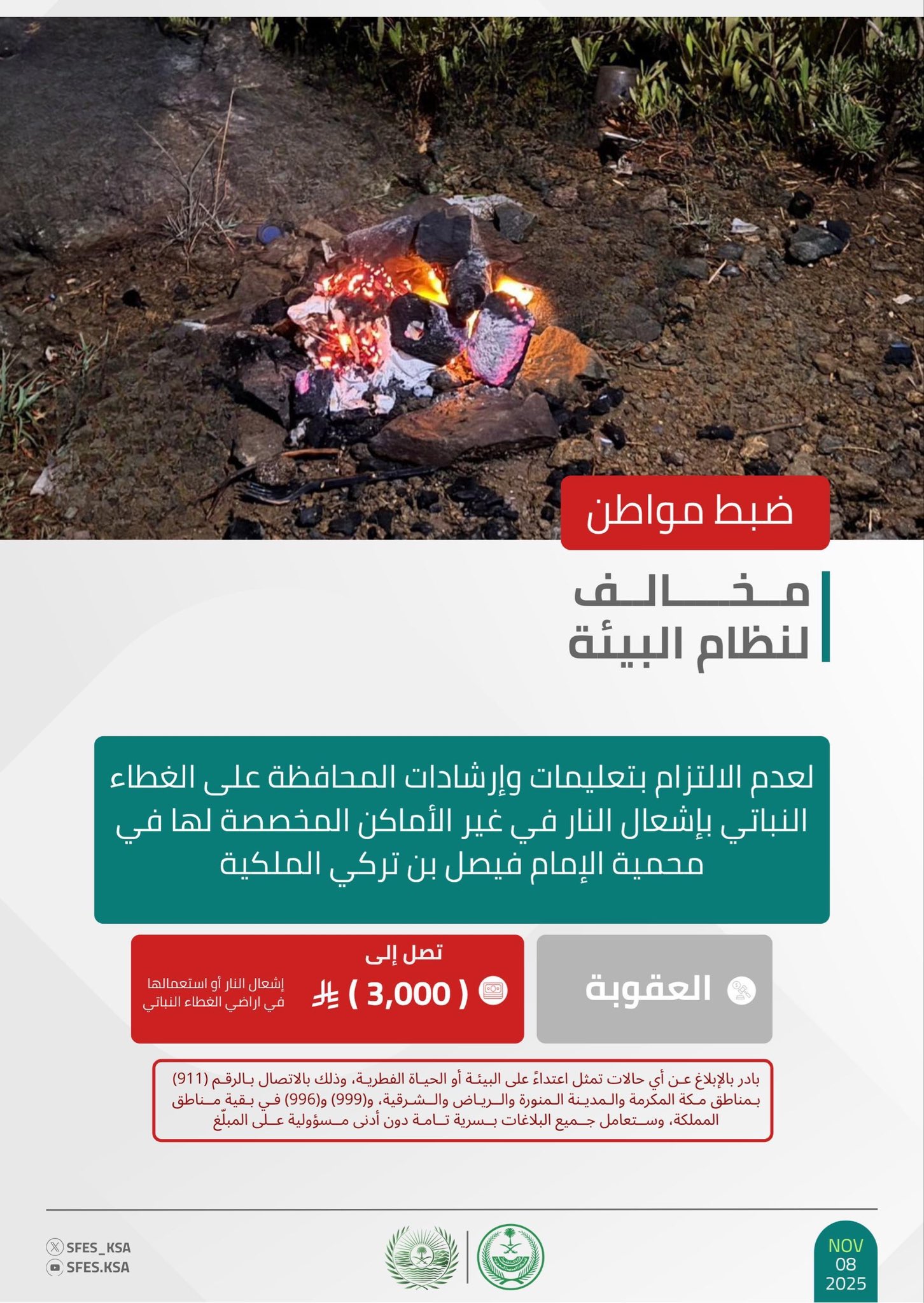 وأكّدت القوات أن عقوبة إشعال النار في غير الأماكن المخصصة لها في الغابات والمتنزهات الوطنية غرامة تصل إلى (3,000) ريال، حاثة على الإبلاغ عن أي حالات تمثل اعتداءً على البيئة أو الحياة الفطرية على الرقم (911) بمناطق مكة المكرمة والمدينة المنورة والرياض والشرقية، و(999) و(996) في بقية مناطق المملكة، وستعامل جميع البلاغات بسرية تامة، دون أدنى مسؤولية على المبلّغ.