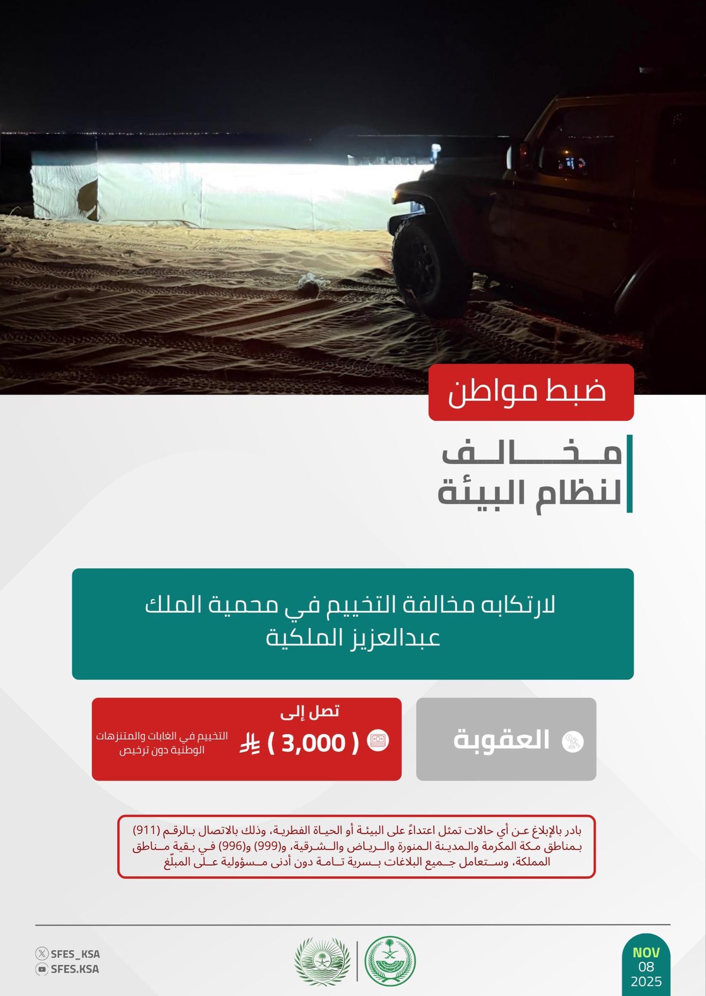 وأوضحت القوات أن عقوبة مخالفة التخييم في الغابات أو المتنزهات الوطنية دون ترخيص غرامة تصل إلى (3,000) ريال، حاثةً على الإبلاغ عن أي حالات تمثل اعتداءً على البيئة أو الحياة الفطرية على الرقم (911) بمناطق مكة المكرمة والمدينة المنورة والرياض والشرقية، و(999) و(996) في بقية مناطق المملكة، وستعامل جميع البلاغات بسرية تامة، دون أدنى مسؤولية على المبلّغ.