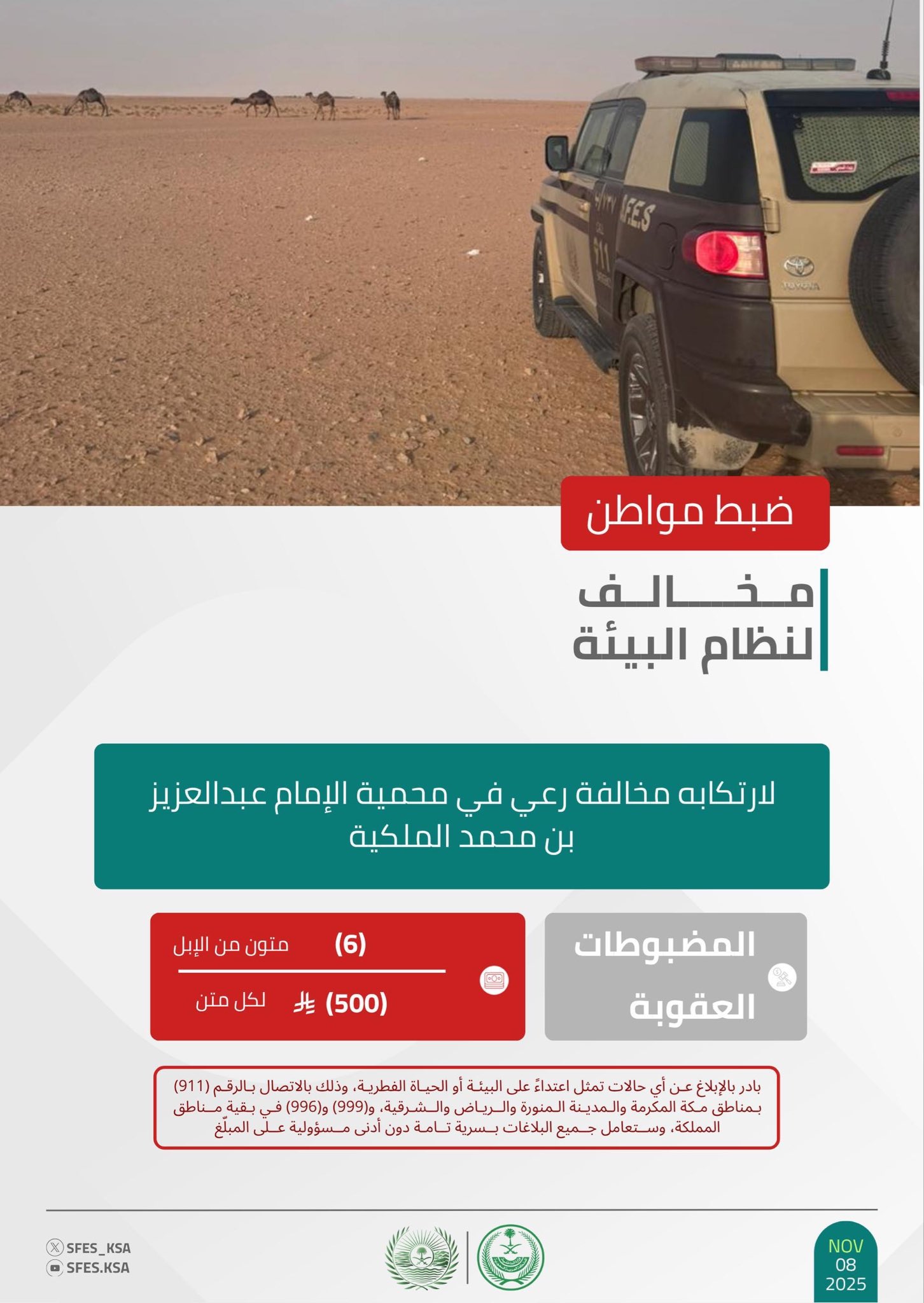 وأكّدت القوات أن عقوبة رعي الإبل غرامة (500) ريال لكل متن، حاثةً على الإبلاغ عن أي حالات تمثل اعتداءً على البيئة أو الحياة الفطرية على الرقم (911) بمناطق مكة المكرمة والمدينة المنورة والرياض والشرقية، و(999) و(996) في بقية مناطق المملكة، وستعامل جميع البلاغات بسرية تامة، دون أدنى مسؤولية على المبلّغ.