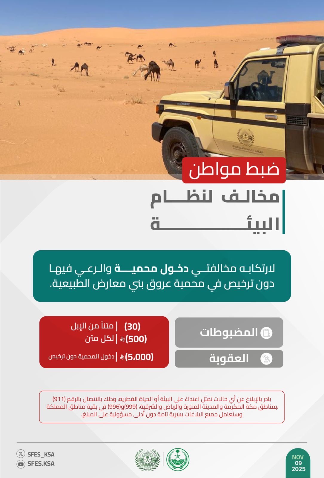 وأكدت القوات أن عقوبة مخالفة دخول المحميات الطبيعية دون ترخيص غرامة (5,000) ريال، وعقوبة رعي الإبل غرامة (500) ريال لكل متن، حاثةً على الإبلاغ عن أي حالات تمثل اعتداءً على البيئة أو الحياة الفطرية على الرقم (911) بمناطق مكة المكرمة والمدينة المنورة والرياض والشرقية، و(999) و(996) في بقية مناطق المملكة، وستعامل جميع البلاغات بسرية تامة دون أدنى مسؤولية على المبلّغ.