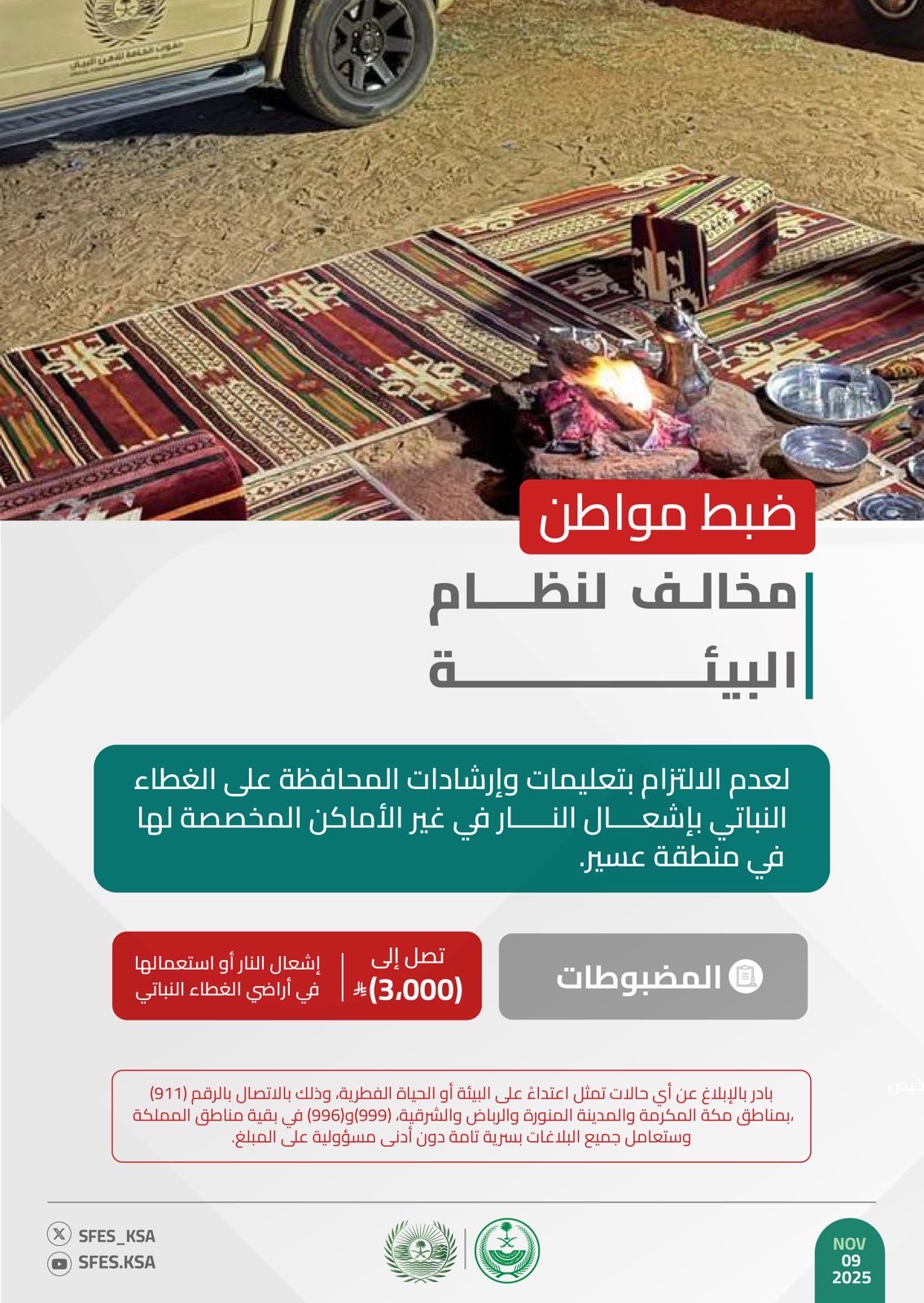 وأكدت القوات أن عقوبة إشعال النار في غير الأماكن المخصصة لها في الغابات والمتنزهات الوطنية غرامة تصل إلى (3,000) ريال، حاثة على الإبلاغ عن أي حالات تمثل اعتداءً على البيئة أو الحياة الفطرية على الرقم (911) بمناطق مكة المكرمة والمدينة المنورة والرياض والشرقية، و(999) و(996) في بقية مناطق المملكة، وستعامل جميع البلاغات بسرية تامة دون أدنى مسؤولية على المبلّغ.
