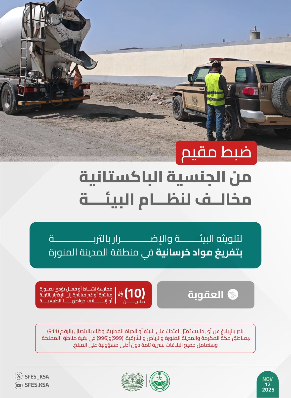 وضبطت القوات الخاصة للأمن البيئي مقيمًا مخالفًا من الجنسية الباكستانية لنظام البيئة؛ لتلويثه البيئة والإضرار بالتربة بتفريغ مواد خرسانية في منطقة المدينة المنورة، وتم تطبيق الإجراءات النظامية بحقه، وإحالته للجهات المختصة.