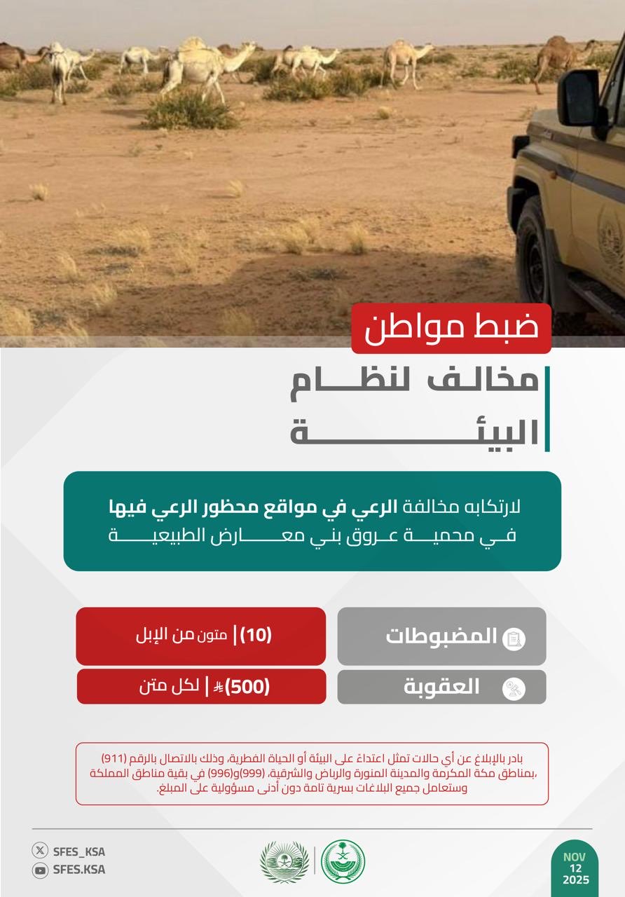 ضبطت القوات الخاصة للأمن البيئي مواطنًا مخالفًا لنظام البيئة، لارتكابه مخالفة رعي (10) متون من الإبل في مواقع محظور الرعي فيها في محمية عروق بني معارض الطبيعية، وتم تطبيق الإجراءات النظامية بحقه.