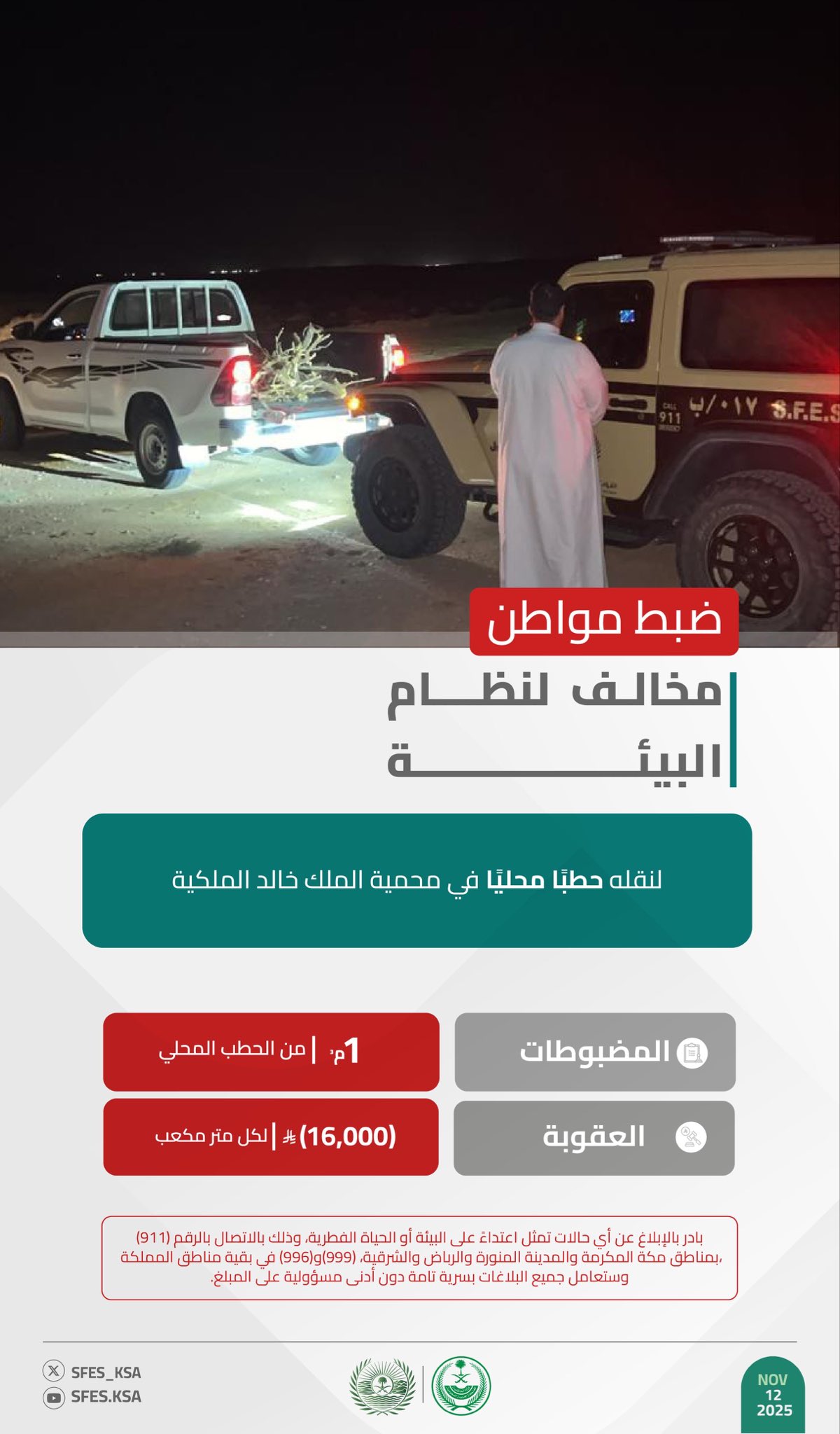 كما ضبطت القوات الخاصة للأمن البيئي مواطنًا مخالفًا لنظام البيئة؛ لنقله مترًا مكعبًا من الحطب المحلي في محمية الملك خالد الملكية، وتم تطبيق الإجراءات النظامية بحقه، وتسليم الكميات المضبوطة للجهة المختصة.