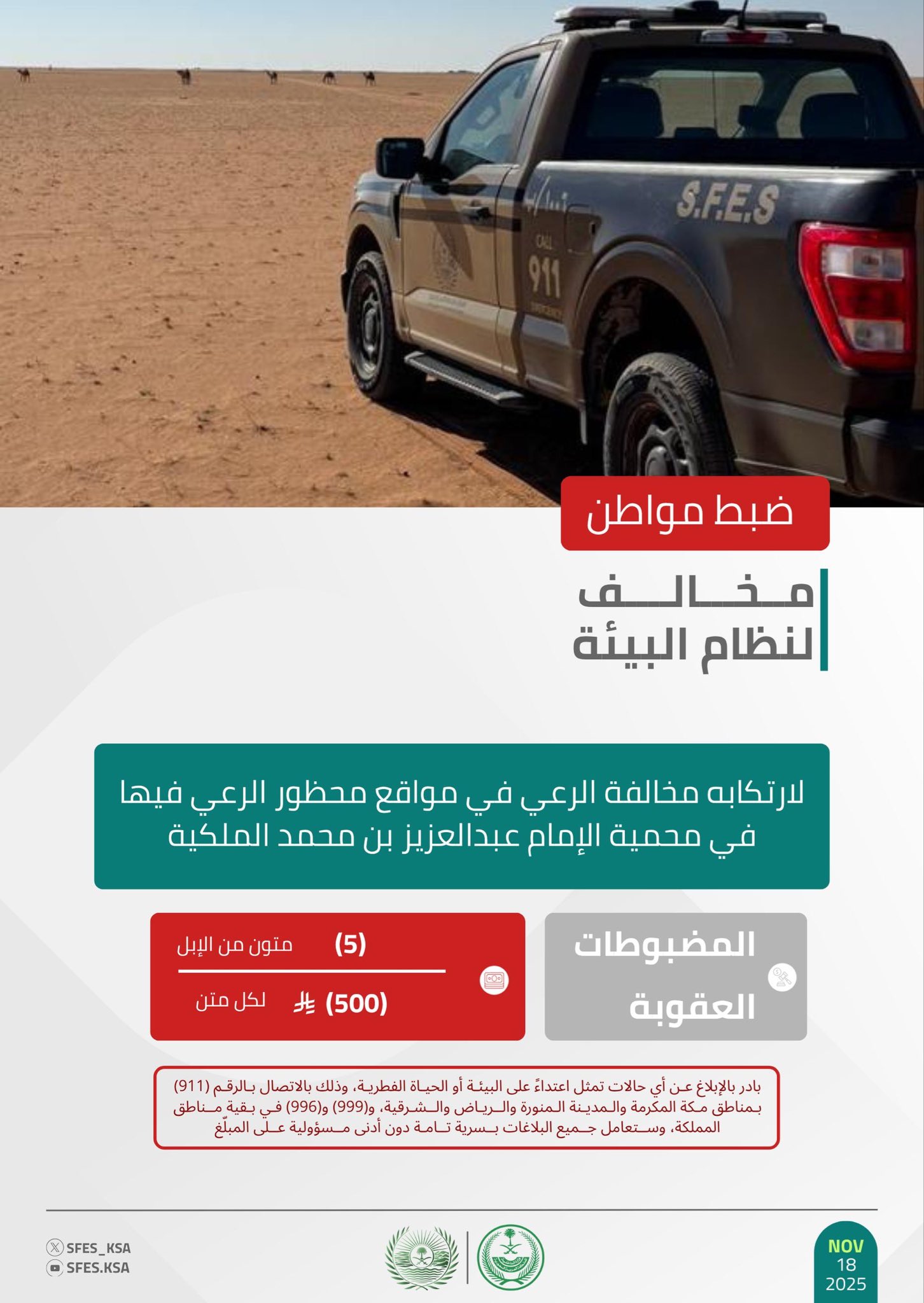 وأكدت القوات أن عقوبة رعي الإبل غرامة (500) ريال لكل متن، حاثةً على الإبلاغ عن أي حالات تمثل اعتداءً على البيئة أو الحياة الفطرية على الرقم (911) بمناطق مكة المكرمة والمدينة المنورة والرياض والشرقية، و(999) و(996) في بقية مناطق المملكة، وستعامل جميع البلاغات بسرية تامة دون أدنى مسؤولية على المبلّغ.