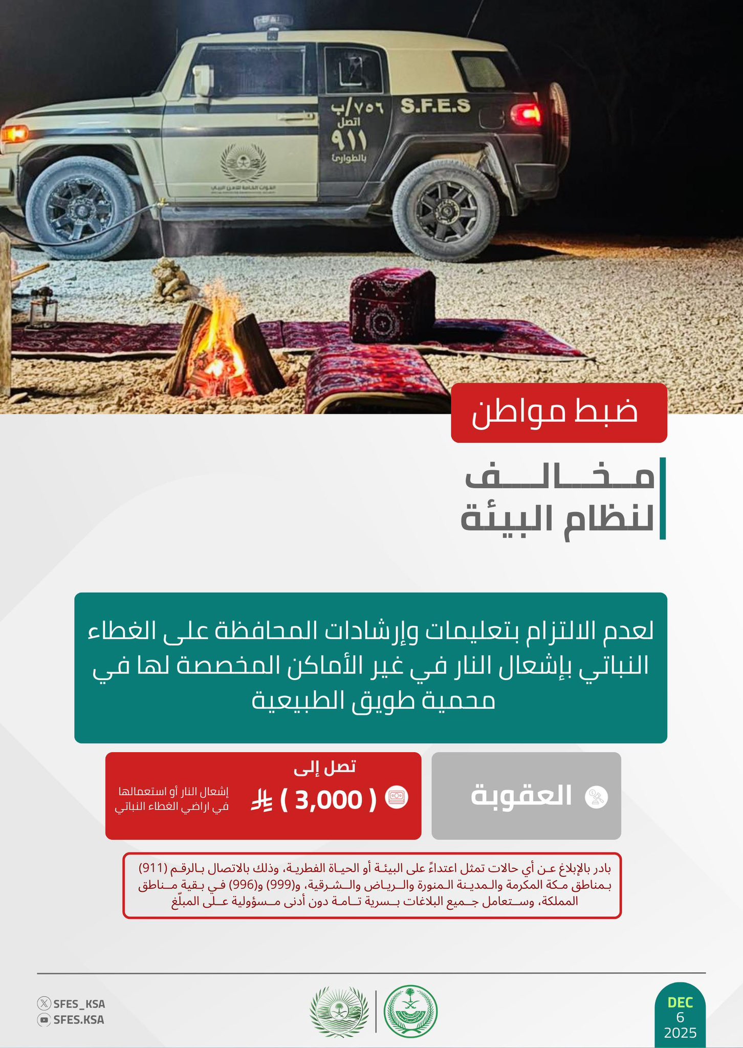 وأكدت القوات أن عقوبة إشعال النار في غير الأماكن المخصصة لها في الغابات والمتنزهات الوطنية غرامة تصل إلى (3,000) ريال، حاثة على الإبلاغ عن أي حالات تمثل اعتداءً على البيئة أو الحياة الفطرية على الرقم (911) بمناطق مكة المكرمة والمدينة المنورة والرياض والشرقية، و(999) و(996) في بقية مناطق المملكة، وستعامل جميع البلاغات بسرية تامة دون أدنى مسؤولية على المبلّغ.