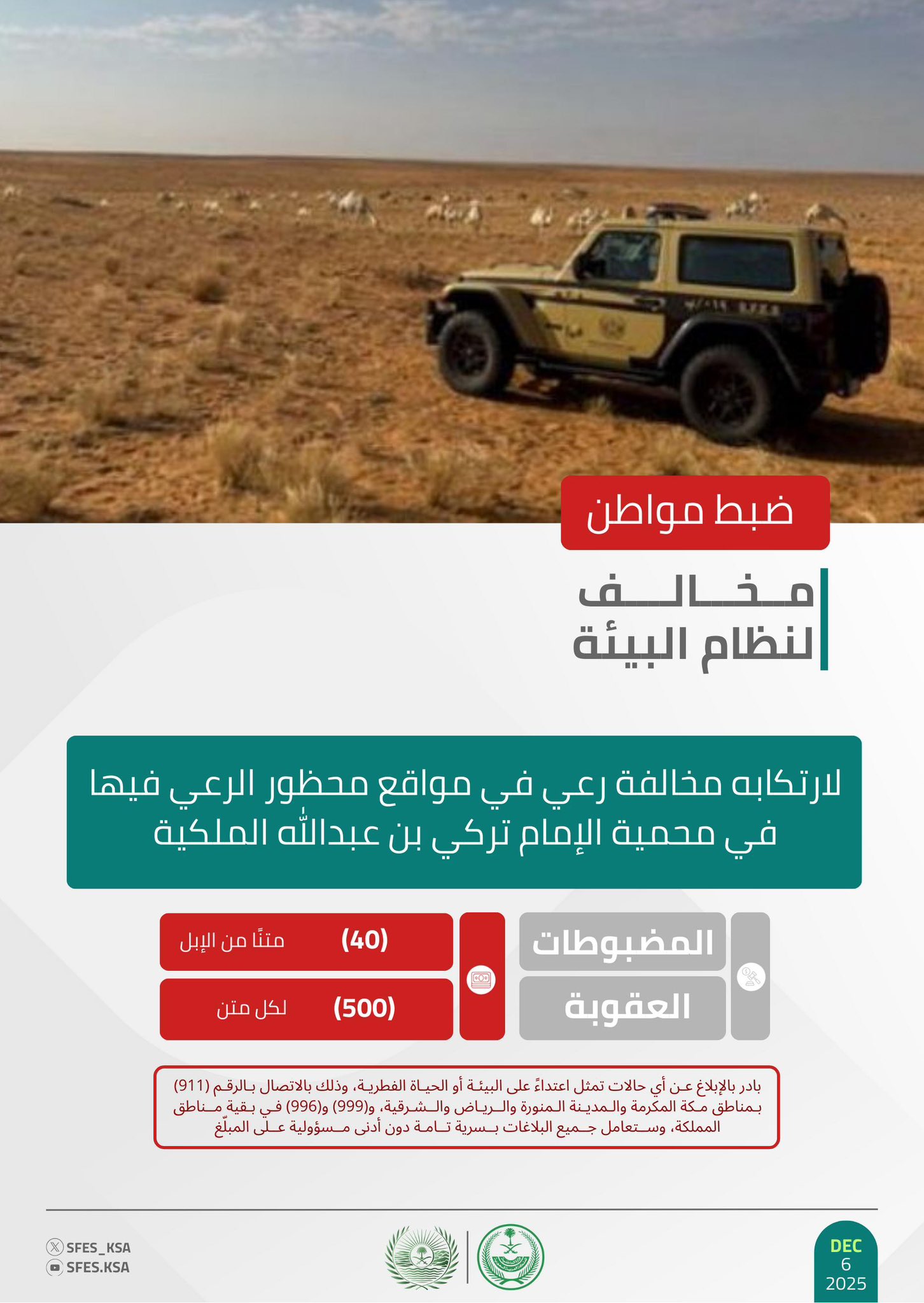 وأكدت القوات أن عقوبة رعي الإبل غرامة (500) ريال لكل متن، حاثةً على الإبلاغ عن أي حالات تمثل اعتداءً على البيئة أو الحياة الفطرية على الرقم (911) بمناطق مكة المكرمة والمدينة المنورة والرياض والشرقية، و(999) و(996) في بقية مناطق المملكة، وستعامل جميع البلاغات بسرية تامة دون أدنى مسؤولية على المبلّغ.