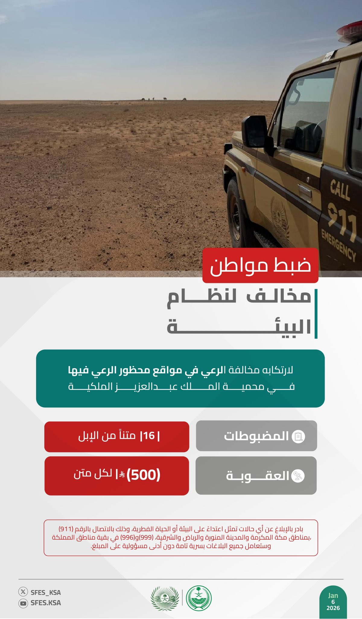 وأكدت القوات أن عقوبة رعي الإبل غرامة (500) ريال لكل متن، حاثةً على الإبلاغ عن أي حالات تمثل اعتداءً على البيئة أو الحياة الفطرية على الرقم (911) بمناطق مكة المكرمة والمدينة المنورة والرياض والشرقية، و(999) و(996) في بقية مناطق المملكة، وستعامل جميع البلاغات بسرية تامة دون أدنى مسؤولية على المبلّغ.