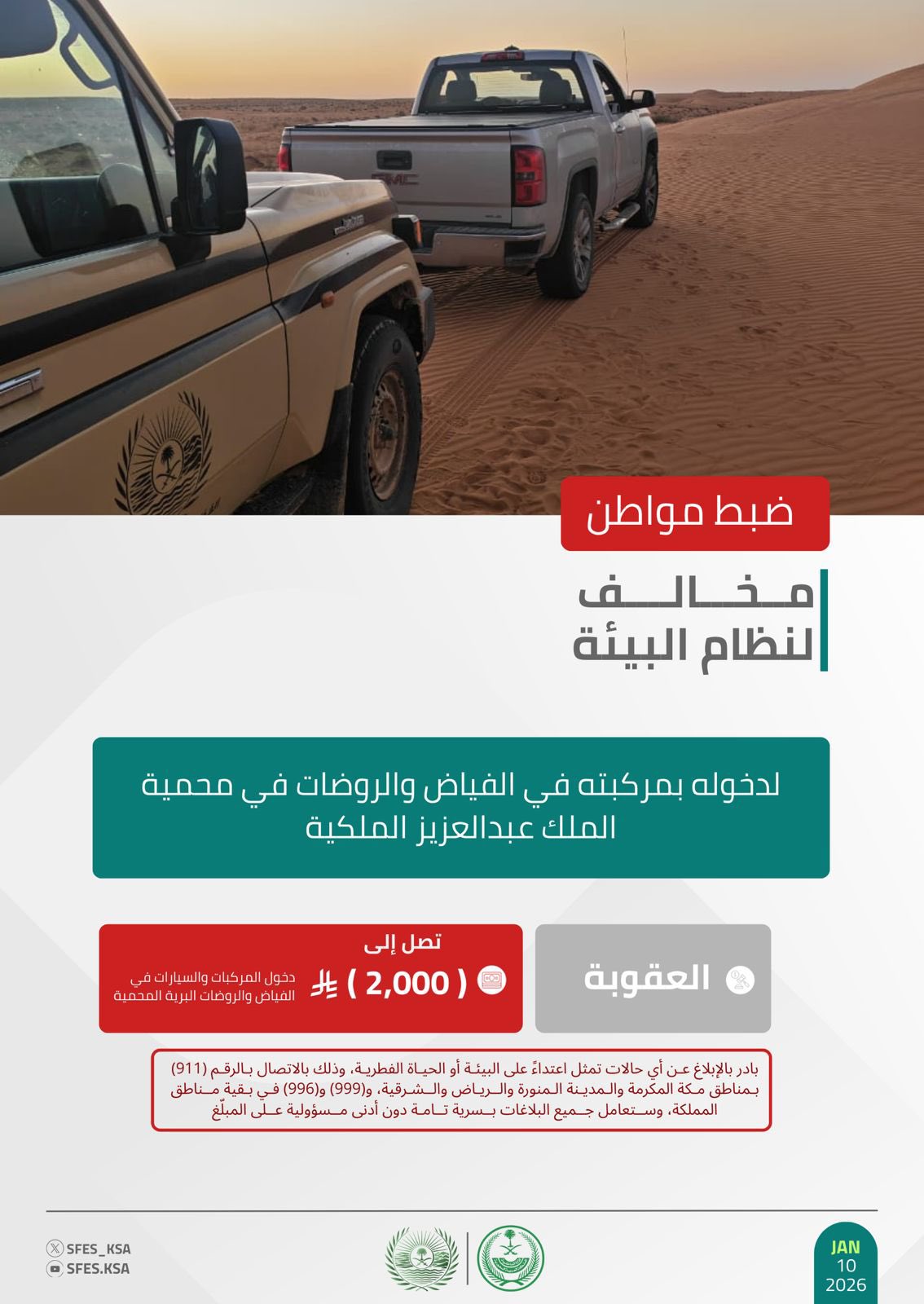 وأوضحت القوات أن عقوبة دخول المركبات والسيارات في الفياض والروضات البرية المحمية تصل إلى (2,000) ريال، حاثةً على الإبلاغ عن أي حالات تمثل اعتداءً على البيئة أو الحياة الفطرية على الرقم (911) بمناطق مكة المكرمة والمدينة المنورة والرياض والشرقية، و(999) و(996) في بقية مناطق المملكة، وستعامل جميع البلاغات بسرية تامة دون أدنى مسؤولية على المبلّغ.