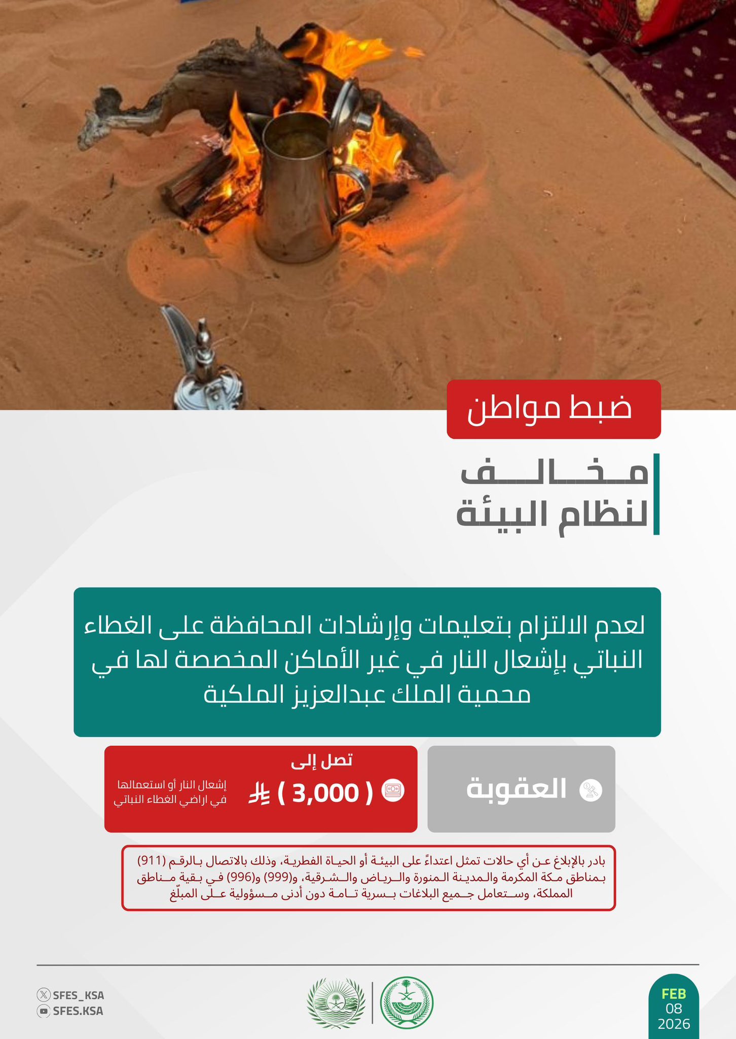 وأكدت القوات أن عقوبة إشعال النار في غير الأماكن المخصصة لها في الغابات والمتنزهات الوطنية غرامة تصل إلى (3,000) ريال، حاثة على الإبلاغ عن أي حالات تمثل اعتداءً على البيئة أو الحياة الفطرية على الرقم (911) بمناطق مكة المكرمة، والمدينة المنورة، والرياض، والشرقية، و (999) و (996) في بقية مناطق المملكة، وستعامل جميع البلاغات بسرية تامة دون أدنى مسؤولية على المبلّغ.