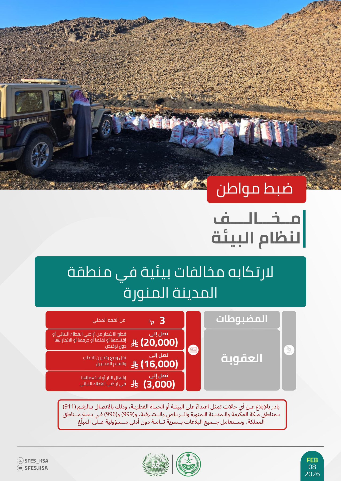 وأوضحت القوات أن عقوبة قطع الأشجار من أراضي الغطاء النباتي أو اقتلاعها أو نقلها أو جرفها أو الاتجار بها دون ترخيص غرامة تصل إلى (20,000) ريال لكل شجرة، وعقوبة نقل وبيع وتخزين الحطب والفحم المحليين غرامة تصل إلى (16,000) ريال لكل متر مكعب، وعقوبة إشعال النار في غير الأماكن المخصصة لها في الغابات والمنتزهات الوطنية غرامة تصل إلى (3,000) ريال، حاثةً على الإبلاغ عن أي حالات تمثل اعتداءً على البيئة أو الحياة الفطرية على الرقم (911) بمناطق مكة المكرمة والمدينة المنورة والرياض والشرقية، و (999) و (996) في بقية مناطق المملكة، وستعامل جميع البلاغات بسرية تامة دون أدنى مسؤولية على المبلّغ.