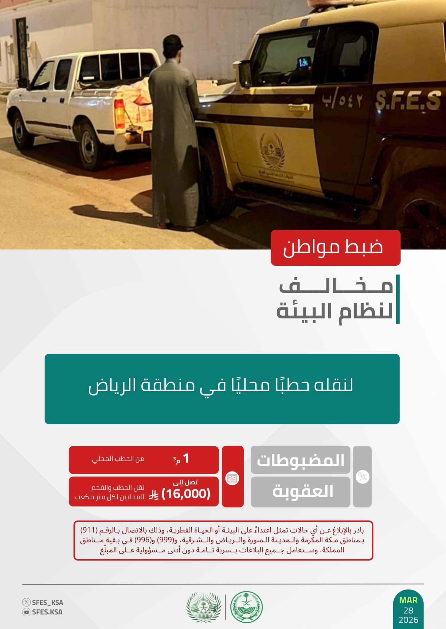 وأوضحت القوات أن عقوبة نقل الحطب والفحم المحليين تصل إلى (16,000) ريال لكل متر مكعب، حاثةً على الإبلاغ عن أي حالات تمثل اعتداءً على البيئة أو الحياة الفطرية على الرقم (911) بمناطق مكة المكرمة والمدينة المنورة والرياض والشرقية، و(999) و(996) في بقية مناطق المملكة، وستعامل جميع البلاغات بسرية تامة دون أدنى مسؤولية على المبلّغ.