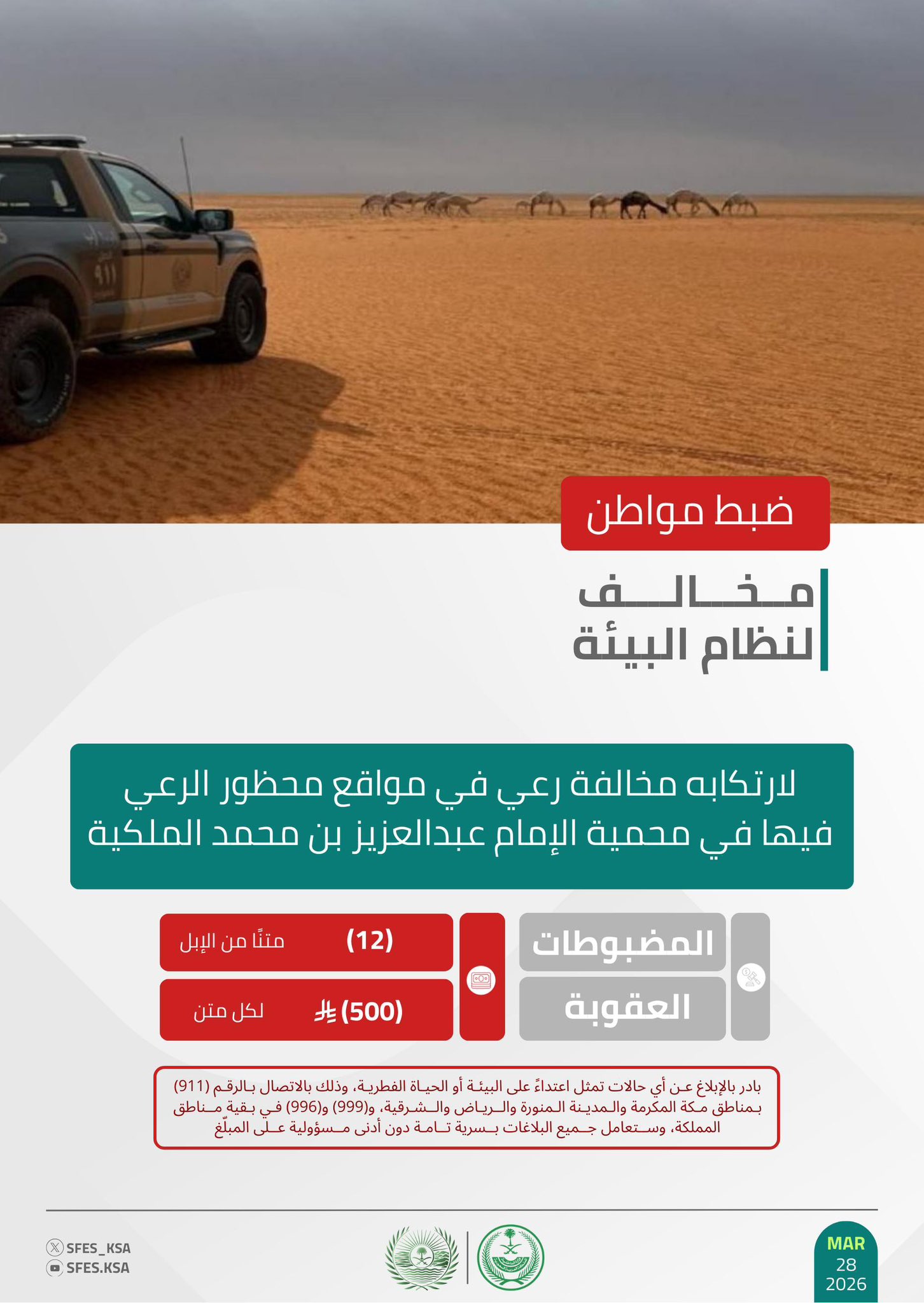 وأكدت القوات أن عقوبة رعي الإبل غرامة (500) ريال لكل متن، حاثةً على الإبلاغ عن أي حالات تمثل اعتداءً على البيئة أو الحياة الفطرية على الرقم (911) بمناطق مكة المكرمة والمدينة المنورة والرياض والشرقية، و(999) و(996) في بقية مناطق المملكة، وستعامل جميع البلاغات بسرية تامة دون أدنى مسؤولية على المبلّغ.