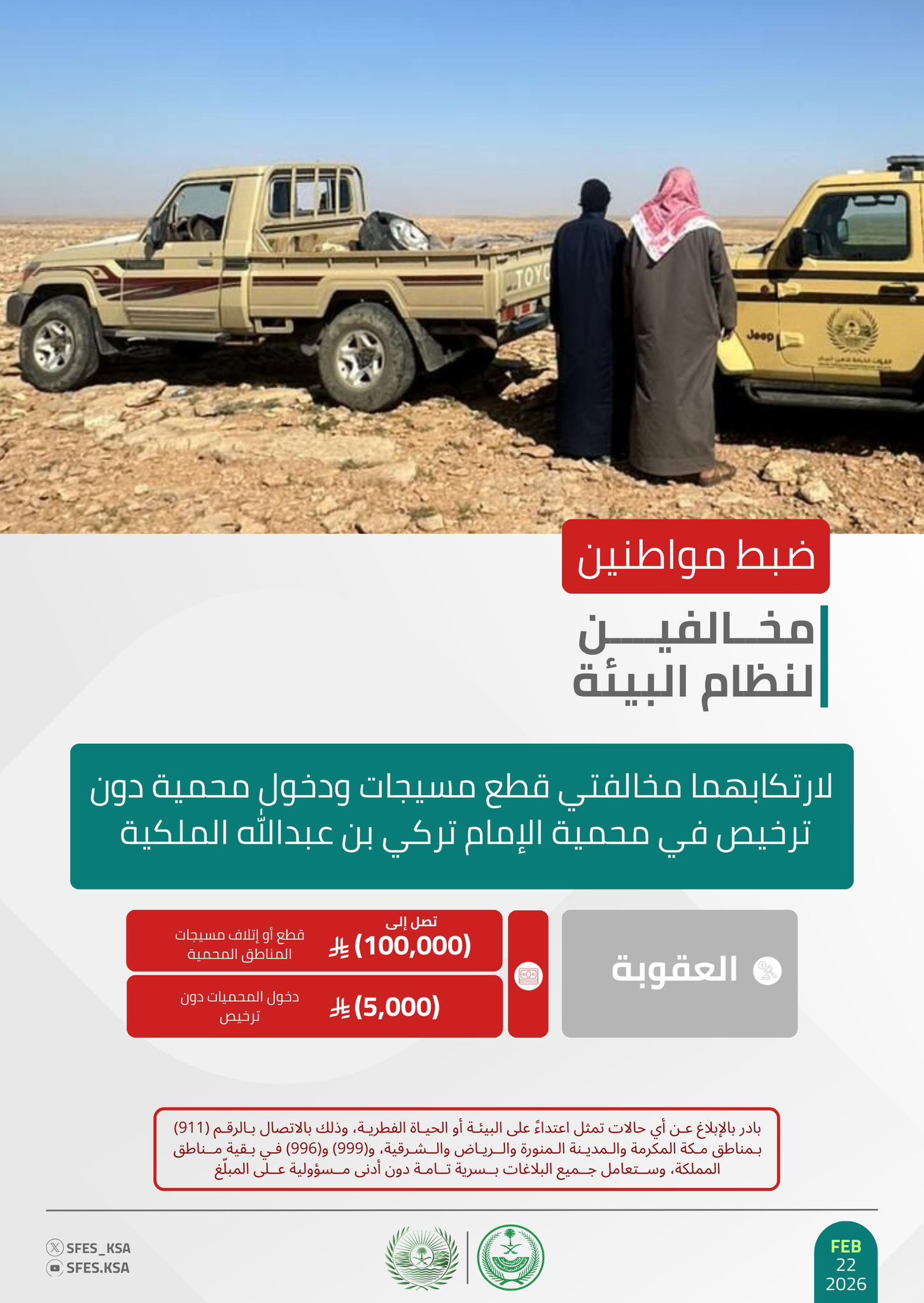 وأوضحت القوات أن عقوبة قطع أو إتلاف مسيجات المناطق المحمية تصل إلى (100,000) ريال، مع إلزام المخالف بمعالجة الأضرار ودفع التعويضات، وعقوبة مخالفة دخول المحميات دون ترخيص غرامة (5,000) ريال، حاثةً على الإبلاغ عن أي حالات تمثل اعتداءً على البيئة أو الحياة الفطرية على الرقم (911) بمناطق مكة المكرمة والمدينة المنورة والرياض والشرقية، و(999) و(996) في بقية مناطق المملكة.