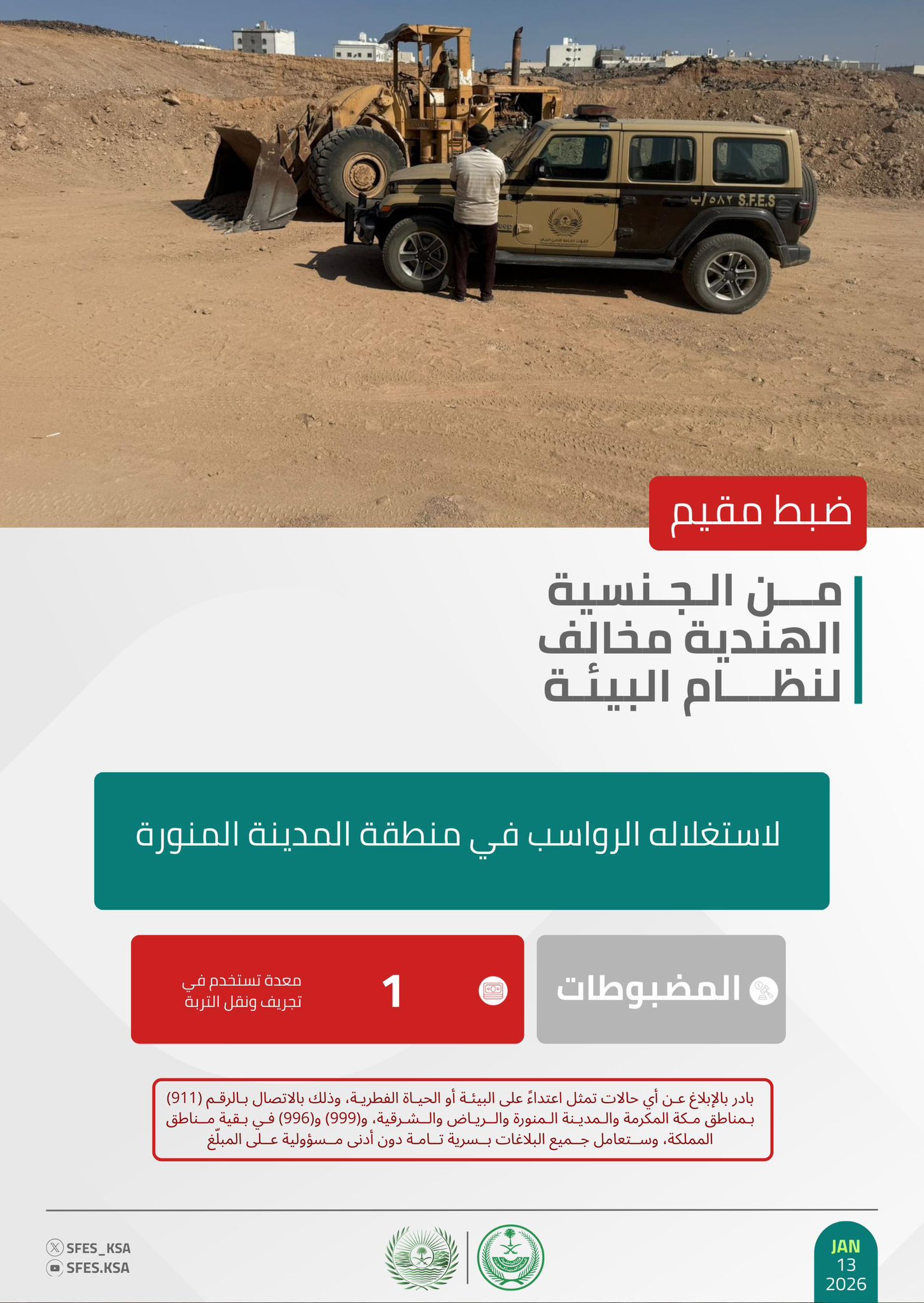 كما ضبطت القوات الخاصة للأمن البيئي مقيمًا مخالفًا لنظام البيئة من الجنسية الهندية، لاستغلاله الرواسب في منطقة المدينة المنورة، وطُبقت الإجراءات النظامية بحقه.