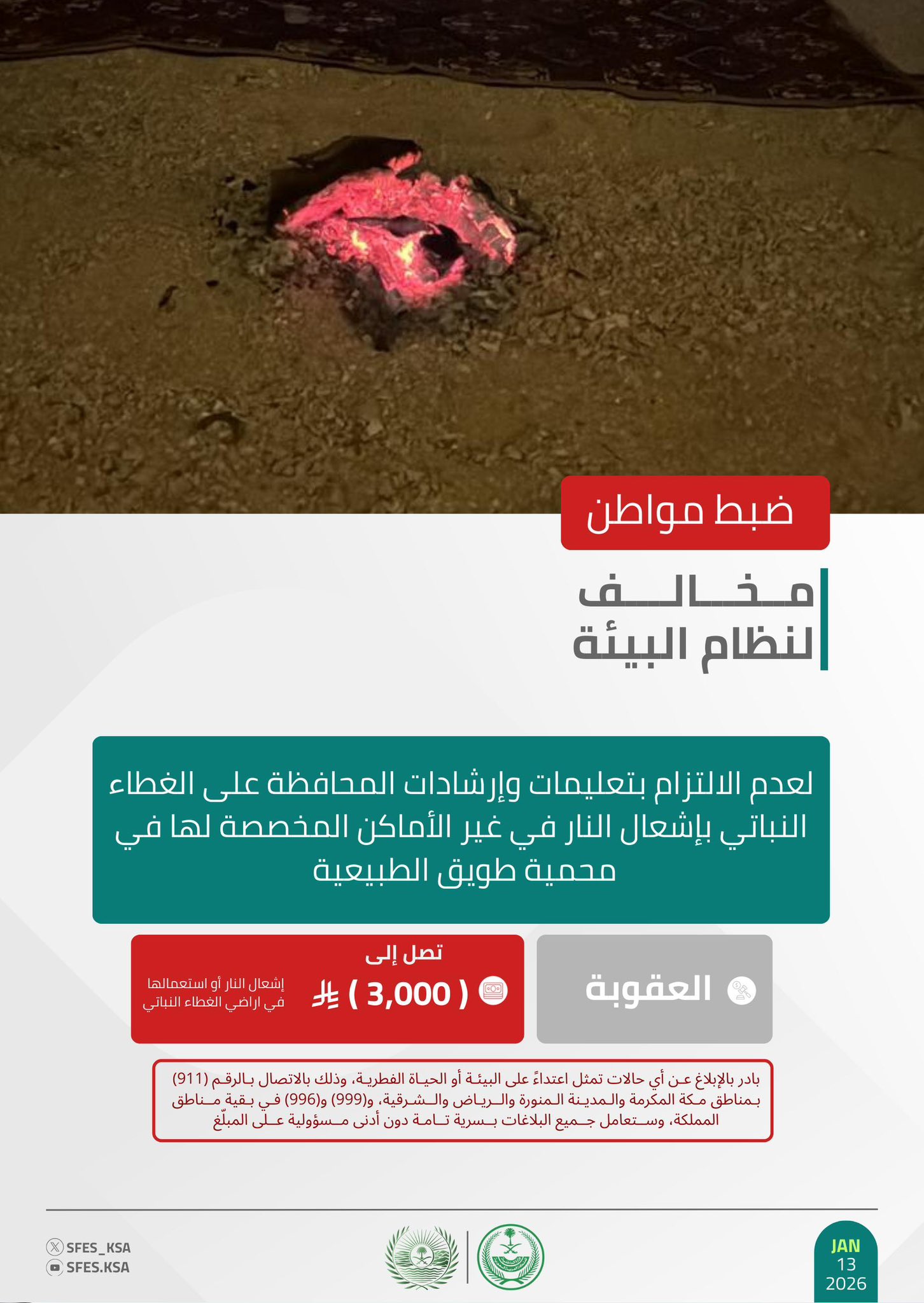 وأكدت القوات أن عقوبة إشعال النار في غير الأماكن المخصصة لها في الغابات والمتنزهات الوطنية غرامة تصل إلى (3,000) ريال، حاثة على الإبلاغ عن أي حالات تمثل اعتداءً على البيئة أو الحياة الفطرية على الرقم (911) بمناطق مكة المكرمة والمدينة المنورة والرياض والشرقية، و (999) و (996) في بقية مناطق المملكة، وستعامل جميع البلاغات بسرية تامة دون أدنى مسؤولية على المبلّغ.