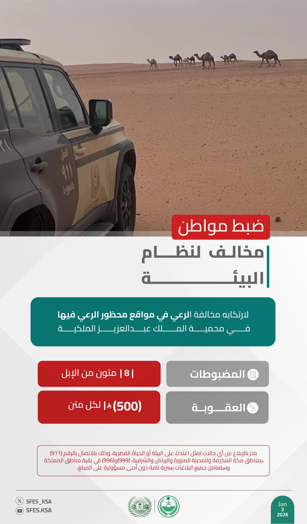 وأكدت القوات أن عقوبة رعي الإبل غرامة (500) ريال لكل متن، حاثةً على الإبلاغ عن أي حالات تمثل اعتداءً على البيئة أو الحياة الفطرية على الرقم (911) بمناطق مكة المكرمة والمدينة المنورة والرياض والشرقية، و(999) و(996) في بقية مناطق المملكة، وستعامل جميع البلاغات بسرية تامة دون أدنى مسؤولية على المبلّغ.