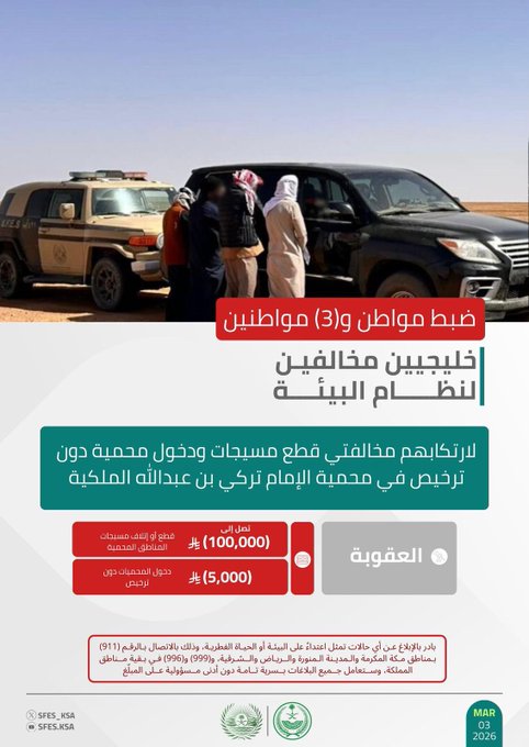 كما نجحت القوات بالتعاون مع هيئة تطوير محمية الإمام تركي بن عبدالله الملكية في ضبط مواطن و3 مواطنين خليجيين بتهمة قطع مسيجات ودخول المحمية دون ترخيص، وهي مخالفات تصل عقوباتها إلى غرامات مالية باهظة وإلزام بإصلاح الأضرار.