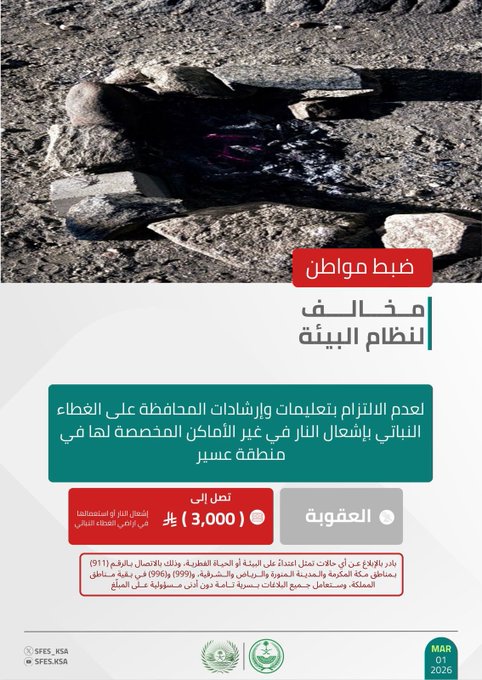 وفي منطقة عسير، تم ضبط مواطن لعدم الالتزام بتعليمات وإرشادات المحافظة على الغطاء النباتي من خلال إشعال النار في غير الأماكن المخصصة لها، وهي مخالفة تصل عقوبتها إلى 3000 ريال.