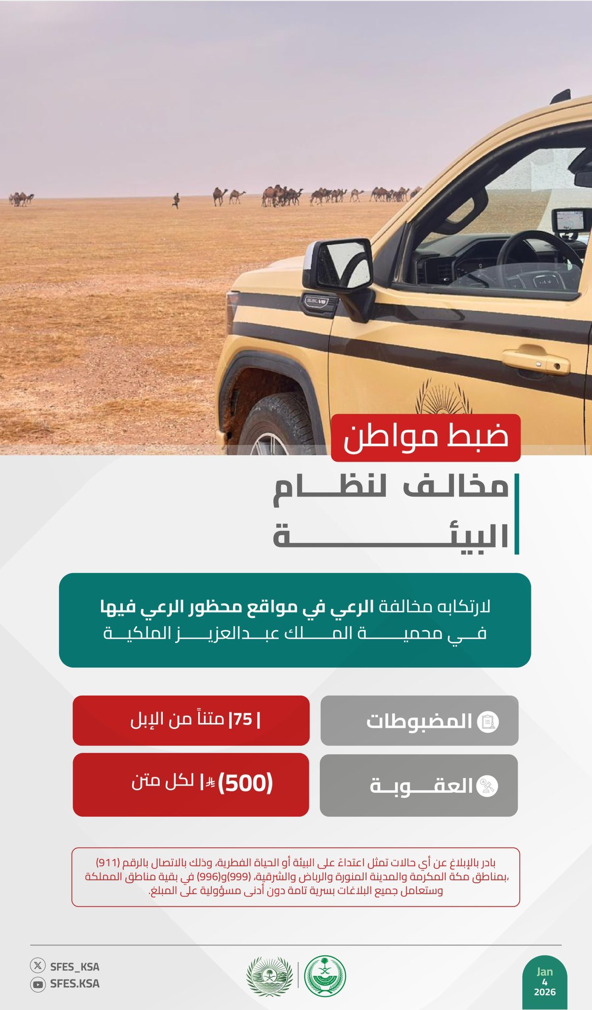 وأكدت القوات أن عقوبة رعي الإبل غرامة (500) ريال لكل متن، حاثةً على الإبلاغ عن أي حالات تمثل اعتداءً على البيئة أو الحياة الفطرية على الرقم (911) بمناطق مكة المكرمة والمدينة المنورة والرياض والشرقية، و(999) و(996) في بقية مناطق المملكة، وستعامل جميع البلاغات بسرية تامة دون أدنى مسؤولية على المبلّغ.