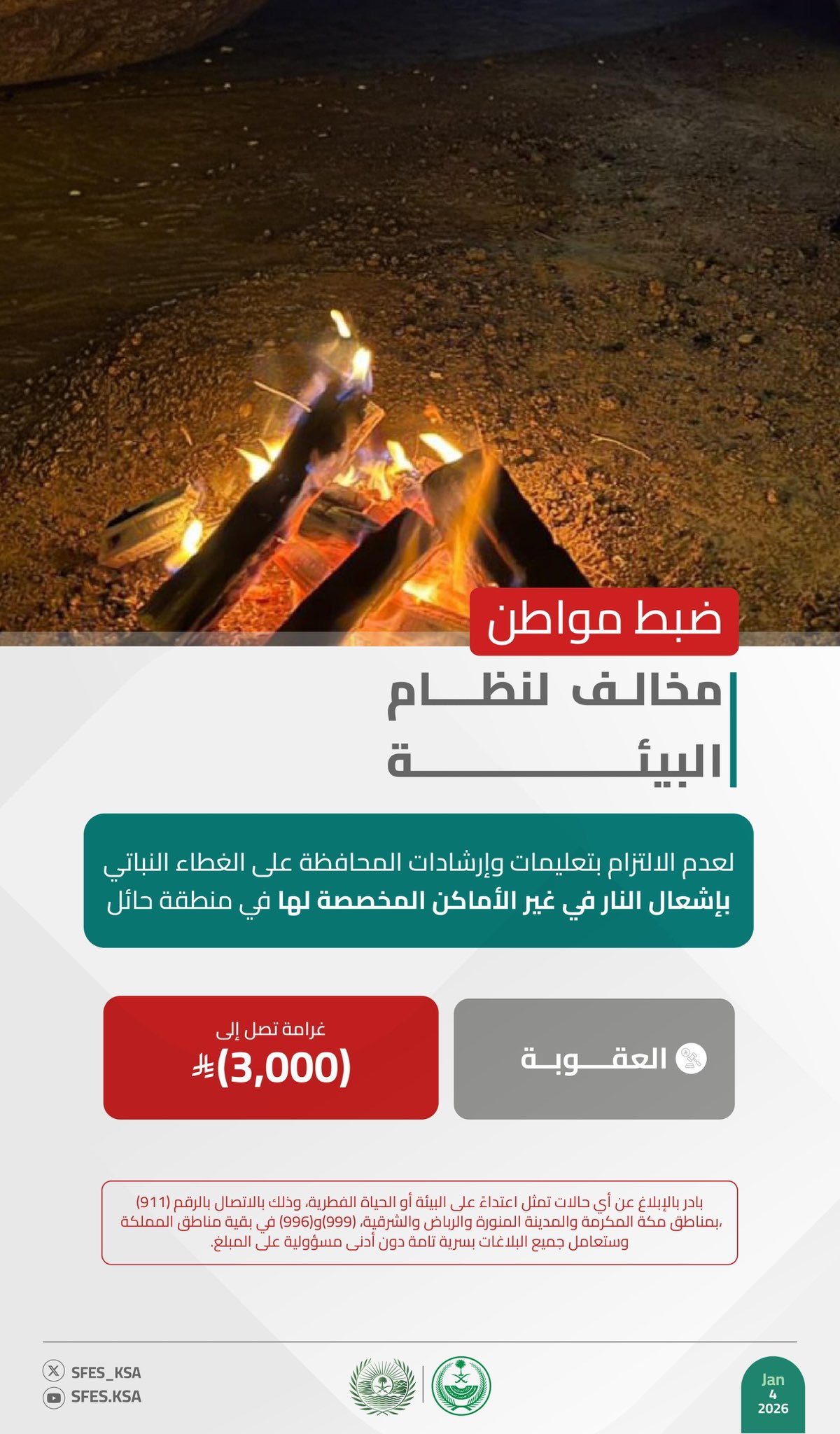 وأكدت القوات أن عقوبة إشعال النار في غير الأماكن المخصصة لها في الغابات والمتنزهات الوطنية غرامة تصل إلى (3,000) ريال، حاثة على الإبلاغ عن أي حالات تمثل اعتداءً على البيئة أو الحياة الفطرية على الرقم (911) بمناطق مكة المكرمة والمدينة المنورة والرياض والشرقية، و(999) و(996) في بقية مناطق المملكة، وستعامل جميع البلاغات بسرية تامة دون أدنى مسؤولية على المبلّغ.