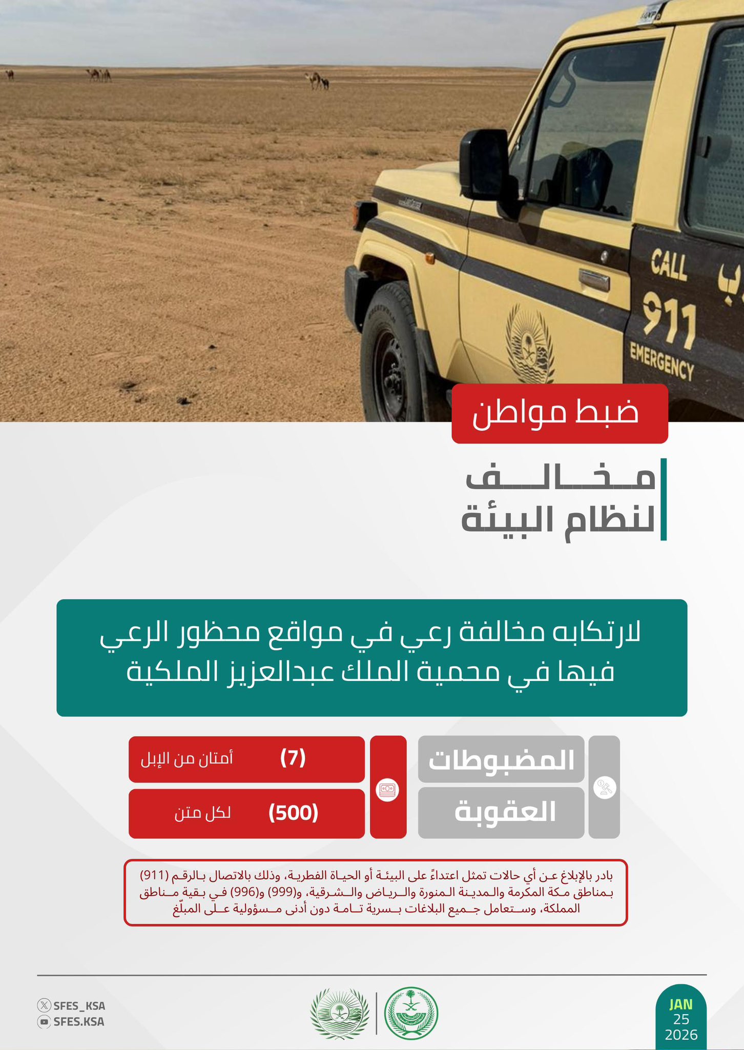 وأكَّدت القوات أن عقوبة رعي الإبل غرامة (500) ريال لكل متن، حاثةً على الإبلاغ عن أي حالات تمثل اعتداءً على البيئة أو الحياة الفطرية على الرقم (911) بمناطق مكة المكرمة والمدينة المنورة والرياض والشرقية، و(999) و(996) في بقية مناطق المملكة، وستعامل جميع البلاغات بسرية تامة دون أدنى مسؤولية على المبلّغ.