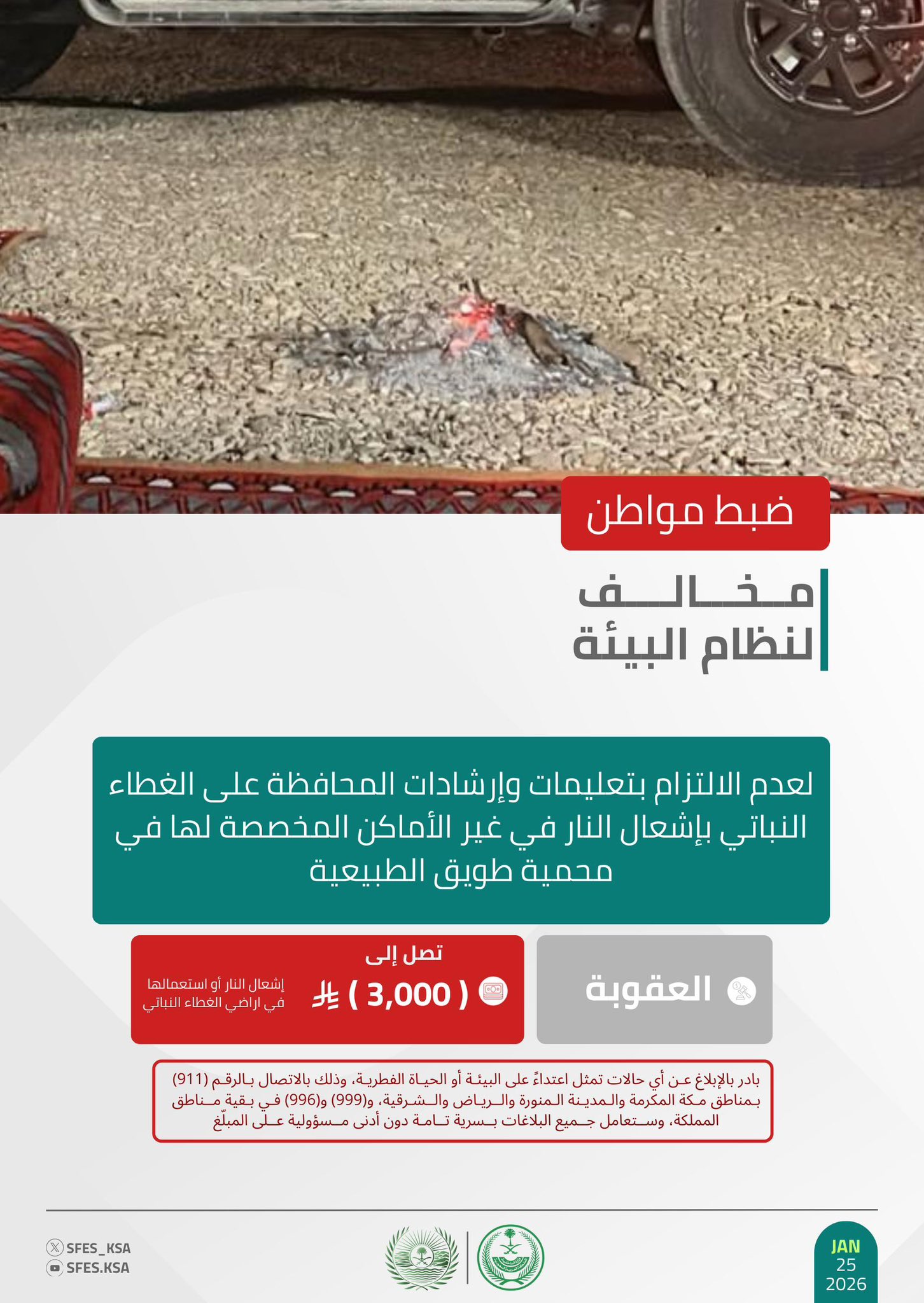 وأكدت القوات أن عقوبة إشعال النار في غير الأماكن المخصصة لها في الغابات والمتنزهات الوطنية غرامة تصل إلى (3,000) ريال، حاثة على الإبلاغ عن أي حالات تمثل اعتداءً على البيئة أو الحياة الفطرية على الرقم (911) بمناطق مكة المكرمة والمدينة المنورة والرياض والشرقية، و(999) و(996) في بقية مناطق المملكة، وستعامل جميع البلاغات بسرية تامة دون أدنى مسؤولية على المبلّغ.