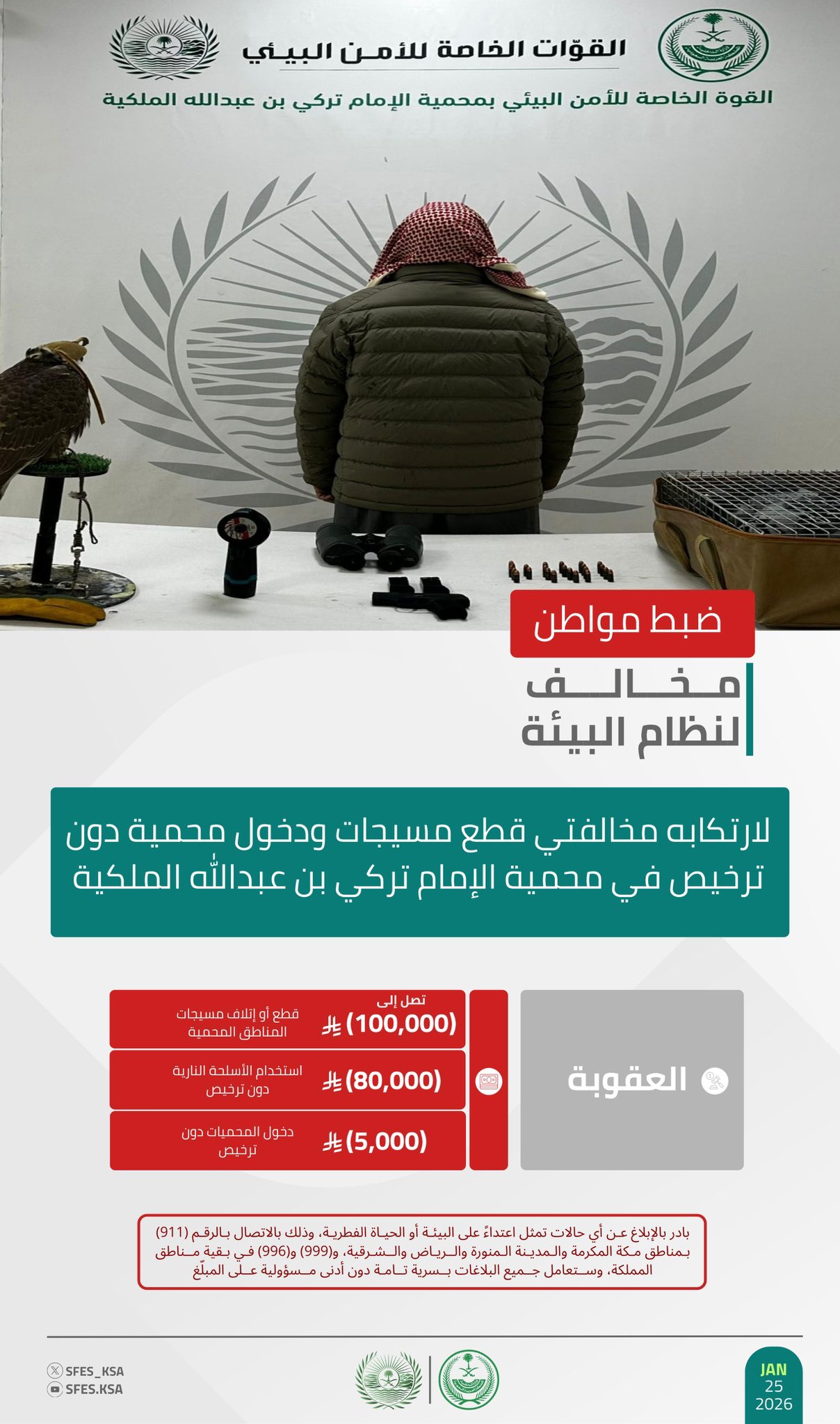 وضبطت القوات الخاصة للأمن البيئي بالتعاون مع هيئة تطوير محمية الإمام تركي بن عبدالله الملكية مواطنًا مخالفًا لنظام البيئة؛ لارتكابه مخالفتي قطع مسيجات ودخول محمية دون ترخيص في محمية الإمام تركي بن عبدالله الملكية، بحوزته سلاح ناري، و(23) ذخيرة نارية، وصقر، و(6) كائنات فطرية حية، وطُبقت الإجراءات النظامية بحقه وأحيل للجهة المختصة.