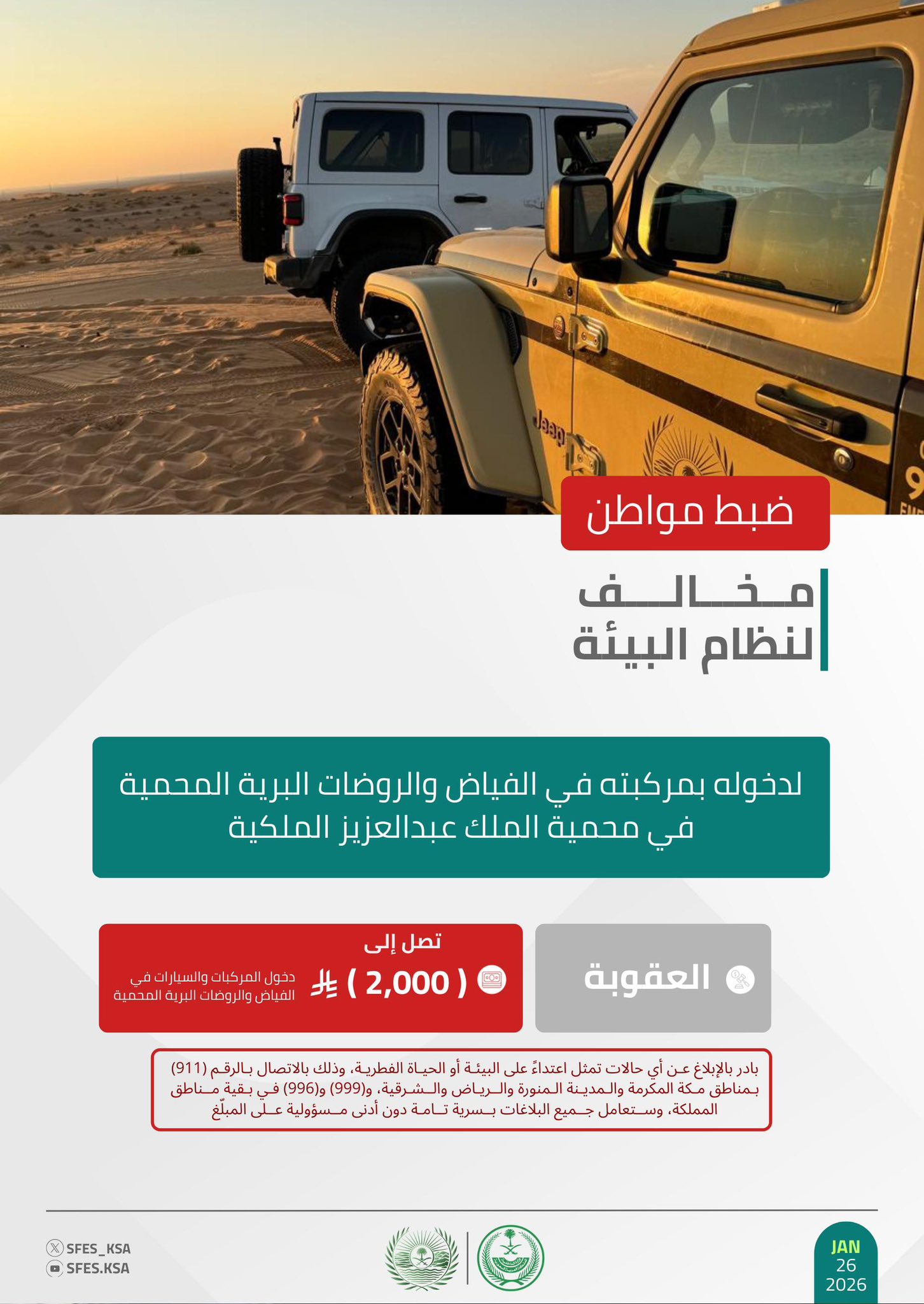 وأوضحت القوات أن عقوبة دخول المركبات والسيارات في الفياض والروضات البرية المحمية تصل إلى (2,000) ريال، حاثةً على الإبلاغ عن أي حالات تمثل اعتداءً على البيئة أو الحياة الفطرية على الرقم (911) بمناطق مكة المكرمة والمدينة المنورة والرياض والشرقية، و(999) و(996) في بقية مناطق المملكة، وستعامل جميع البلاغات بسرية تامة دون أدنى مسؤولية على المبلّغ.