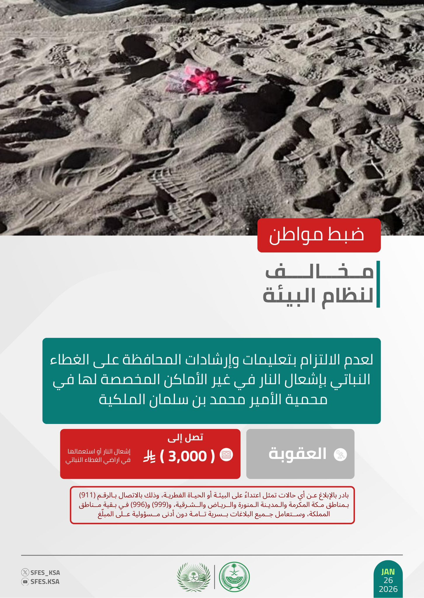 وأكَّدت القوات أن عقوبة إشعال النار في غير الأماكن المخصصة لها في الغابات والمتنزهات الوطنية غرامة تصل إلى (3,000) ريال، حاثة على الإبلاغ عن أي حالات تمثل اعتداءً على البيئة أو الحياة الفطرية على الرقم (911) بمناطق مكة المكرمة والمدينة المنورة والرياض والشرقية، و(999) و(996) في بقية مناطق المملكة، وستعامل جميع البلاغات بسرية تامة دون أدنى مسؤولية على المبلّغ.