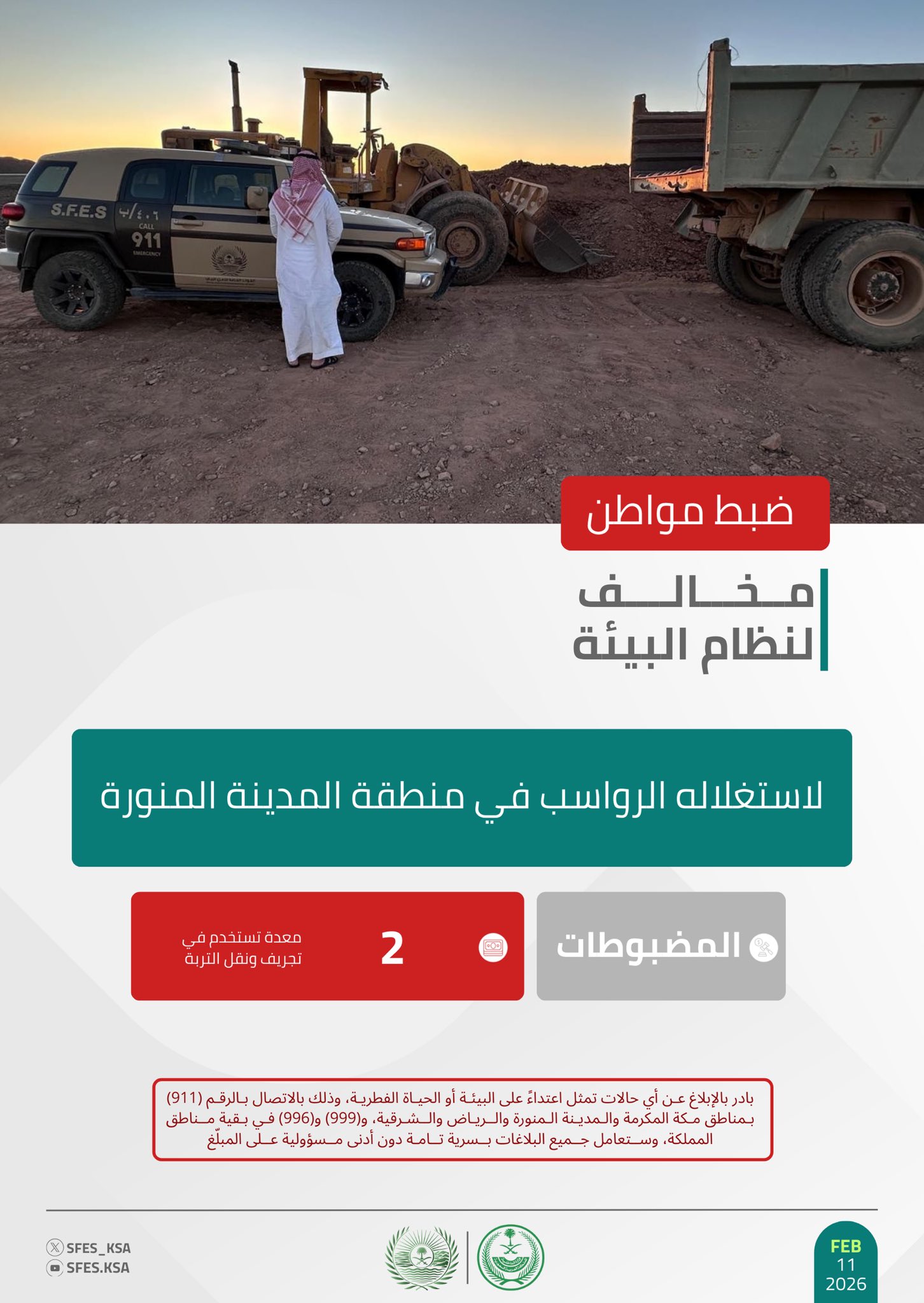 وأوضحت القوات أنه جرى ضبط معدتين تستخدمان في تجريف ونقل التربة، حاثةً على الإبلاغ عن أي حالات تمثل اعتداءً على البيئة أو الحياة الفطرية على الأرقام (911) بمناطق مكة المكرمة، والمدينة المنورة، والرياض، والشرقية، و(999) و(996) في بقية مناطق المملكة، وستعامل جميع البلاغات بسرية تامة دون أدنى مسؤولية على المبلّغ.