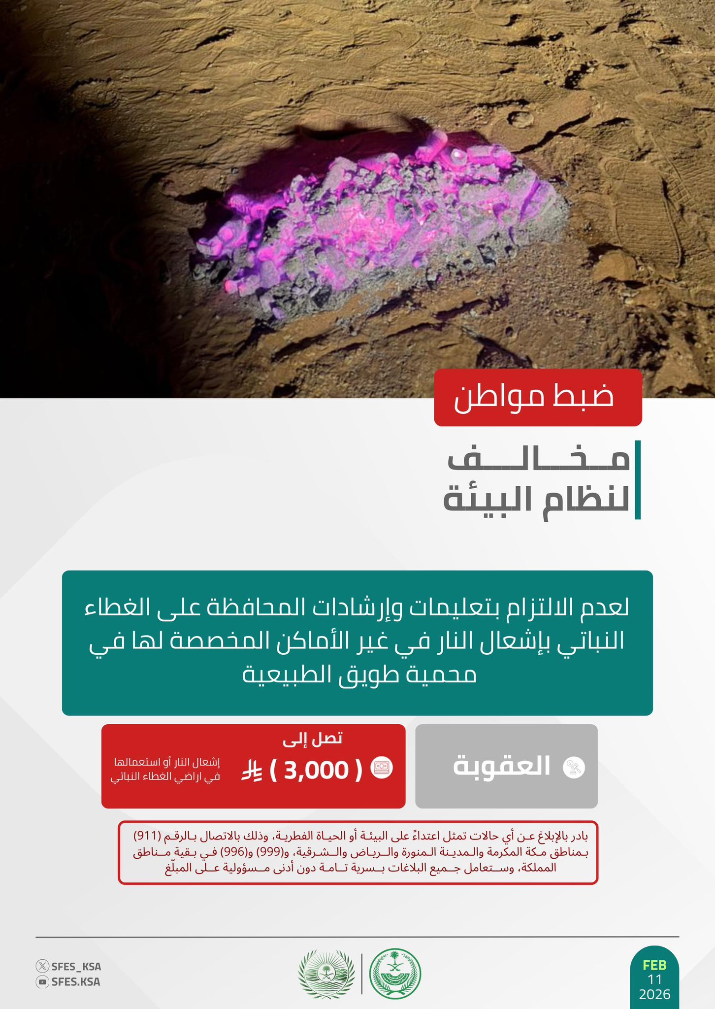 وأكدت القوات أن عقوبة إشعال النار في غير الأماكن المخصصة لها في الغابات والمتنزهات الوطنية غرامة تصل إلى (3,000) ريال، حاثة على الإبلاغ عن أي حالات تمثل اعتداءً على البيئة أو الحياة الفطرية على الرقم (911) بمناطق مكة المكرمة، والمدينة المنورة، والرياض، والشرقية، و(999)، و(996) في بقية مناطق المملكة، وستعامل جميع البلاغات بسرية تامة دون أدنى مسؤولية على المبلّغ.