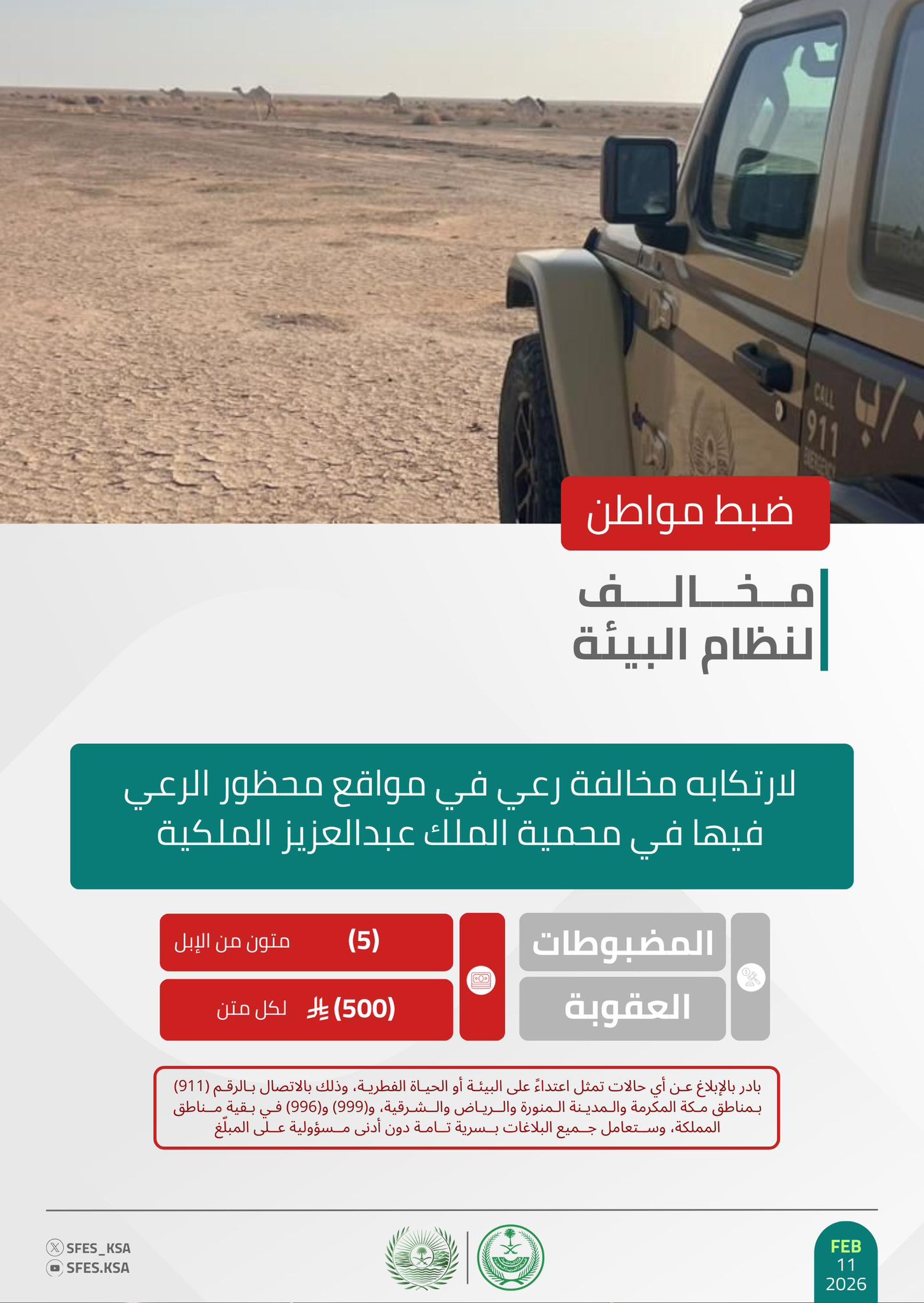 وأكدت القوات أن عقوبة رعي الإبل غرامة (500) ريال لكل متن، حاثةً على الإبلاغ عن أي حالات تمثل اعتداءً على البيئة أو الحياة الفطرية على الرقم (911) بمناطق مكة المكرمة، والمدينة المنورة، والرياض، والشرقية، و(999)، و(996) في بقية مناطق المملكة، وستعامل جميع البلاغات بسرية تامة دون أدنى مسؤولية على المبلّغ.