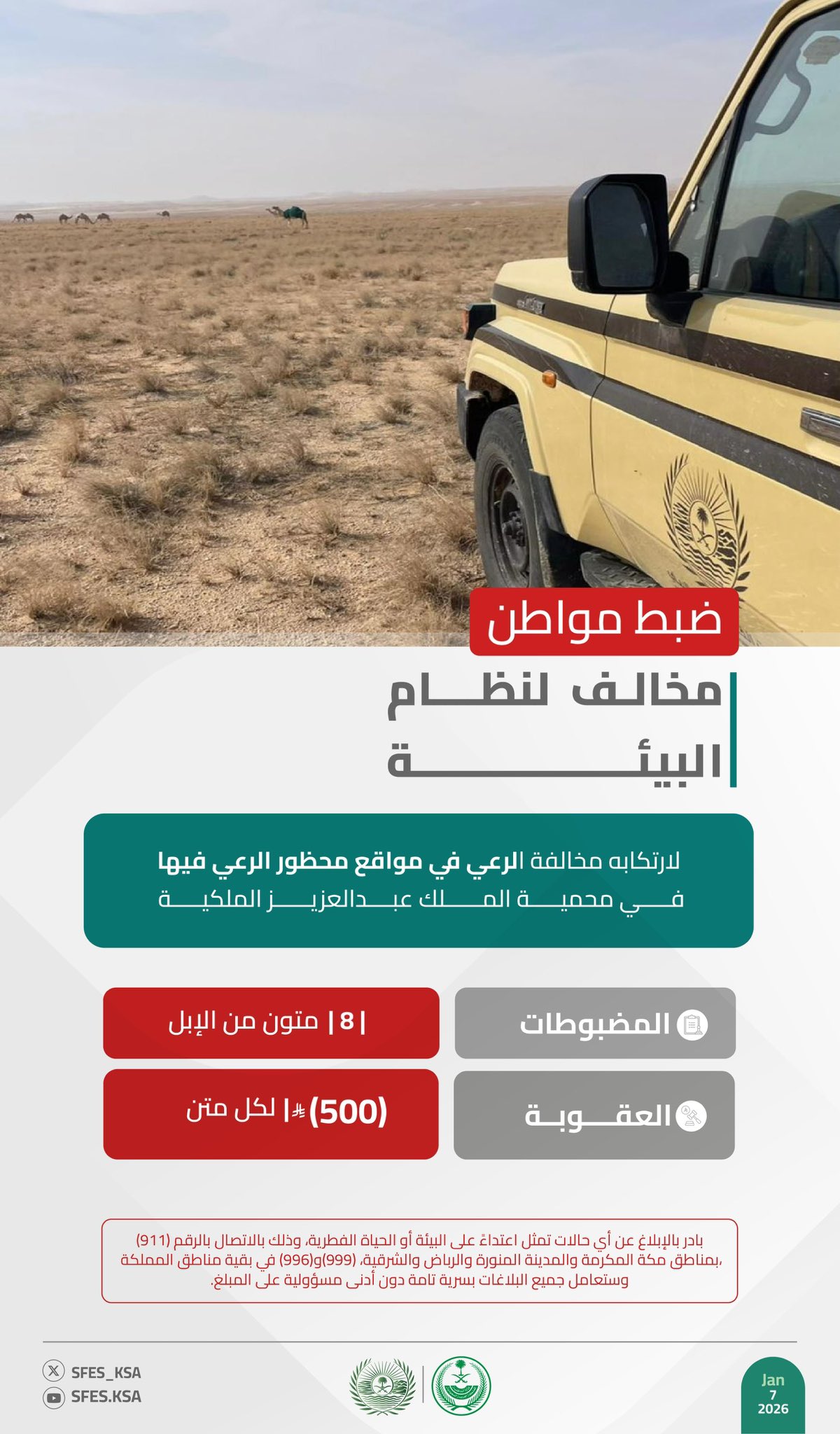 وأكدت القوات أن عقوبة رعي الإبل غرامة (500) ريال لكل متن، حاثةً على الإبلاغ عن أي حالات تمثل اعتداءً على البيئة أو الحياة الفطرية على الرقم (911) بمناطق مكة المكرمة والمدينة المنورة والرياض والشرقية، و(999) و(996) في بقية مناطق المملكة، وستعامل جميع البلاغات بسرية تامة دون أدنى مسؤولية على المبلّغ.