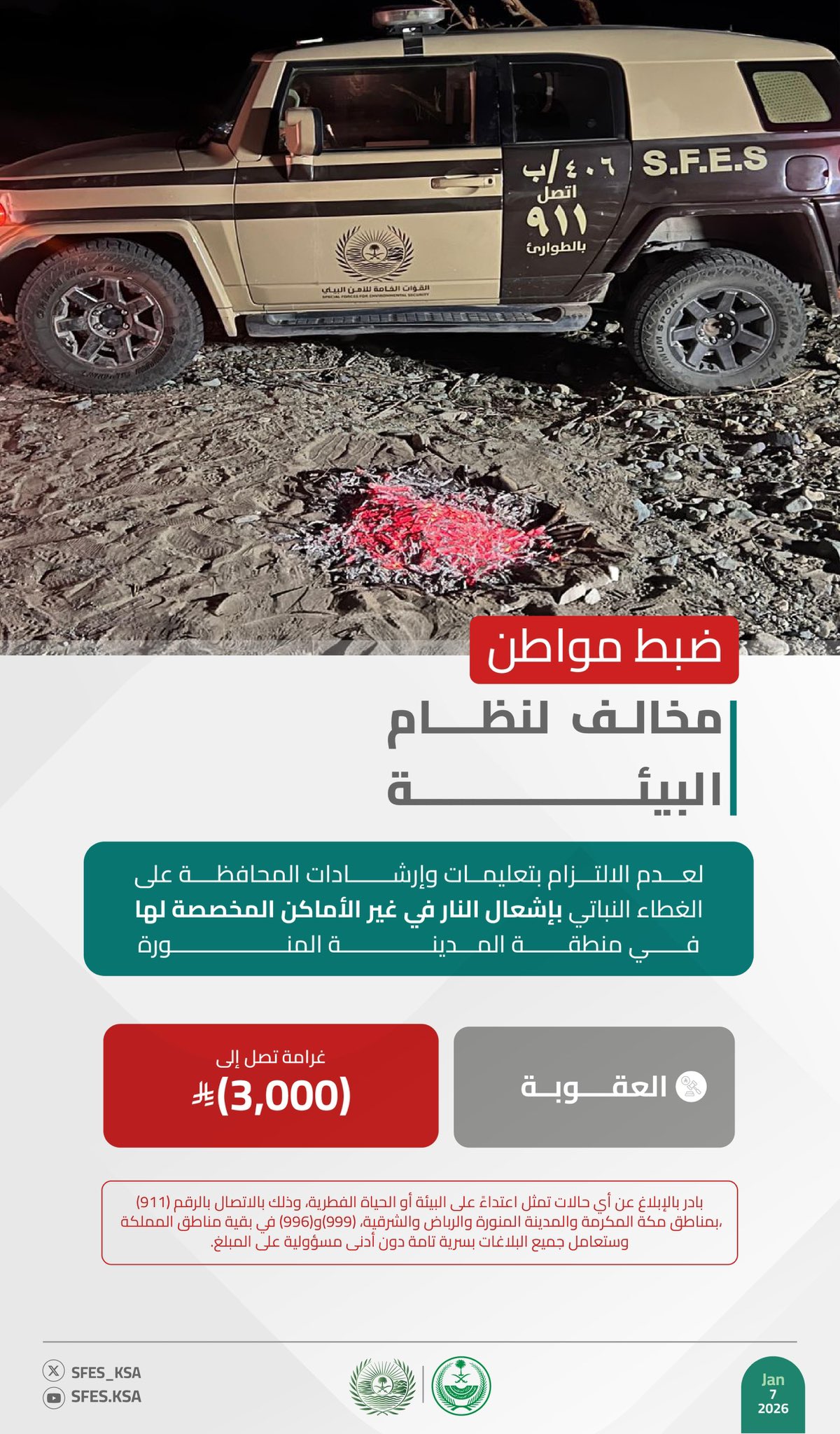 وأكدت القوات أن عقوبة إشعال النار في غير الأماكن المخصصة لها في الغابات والمتنزهات الوطنية غرامة تصل إلى (3,000) ريال، حاثة على الإبلاغ عن أي حالات تمثل اعتداءً على البيئة أو الحياة الفطرية على الرقم (911) بمناطق مكة المكرمة والمدينة المنورة والرياض والشرقية، و(999) و(996) في بقية مناطق المملكة، وستعامل جميع البلاغات بسرية تامة دون أدنى مسؤولية على المبلّغ.