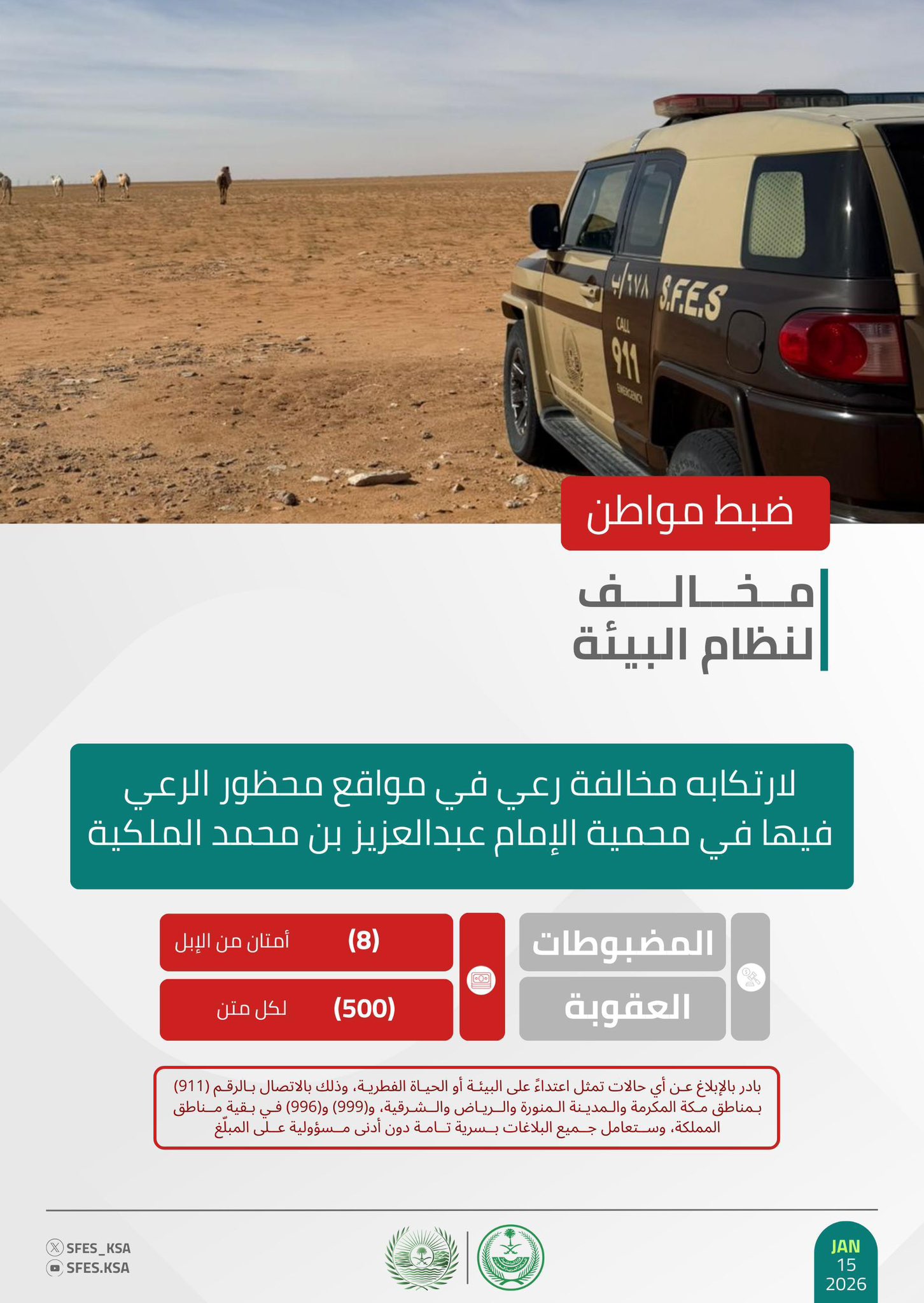 وأكدت القوات أن عقوبة رعي الإبل غرامة (500) ريال لكل متن، حاثةً على الإبلاغ عن أي حالات تمثل اعتداءً على البيئة أو الحياة الفطرية على الرقم (911) بمناطق مكة المكرمة والمدينة المنورة والرياض والشرقية، و (999) و (996) في بقية مناطق المملكة، وستعامل جميع البلاغات بسرية تامة دون أدنى مسؤولية على المبلّغ.