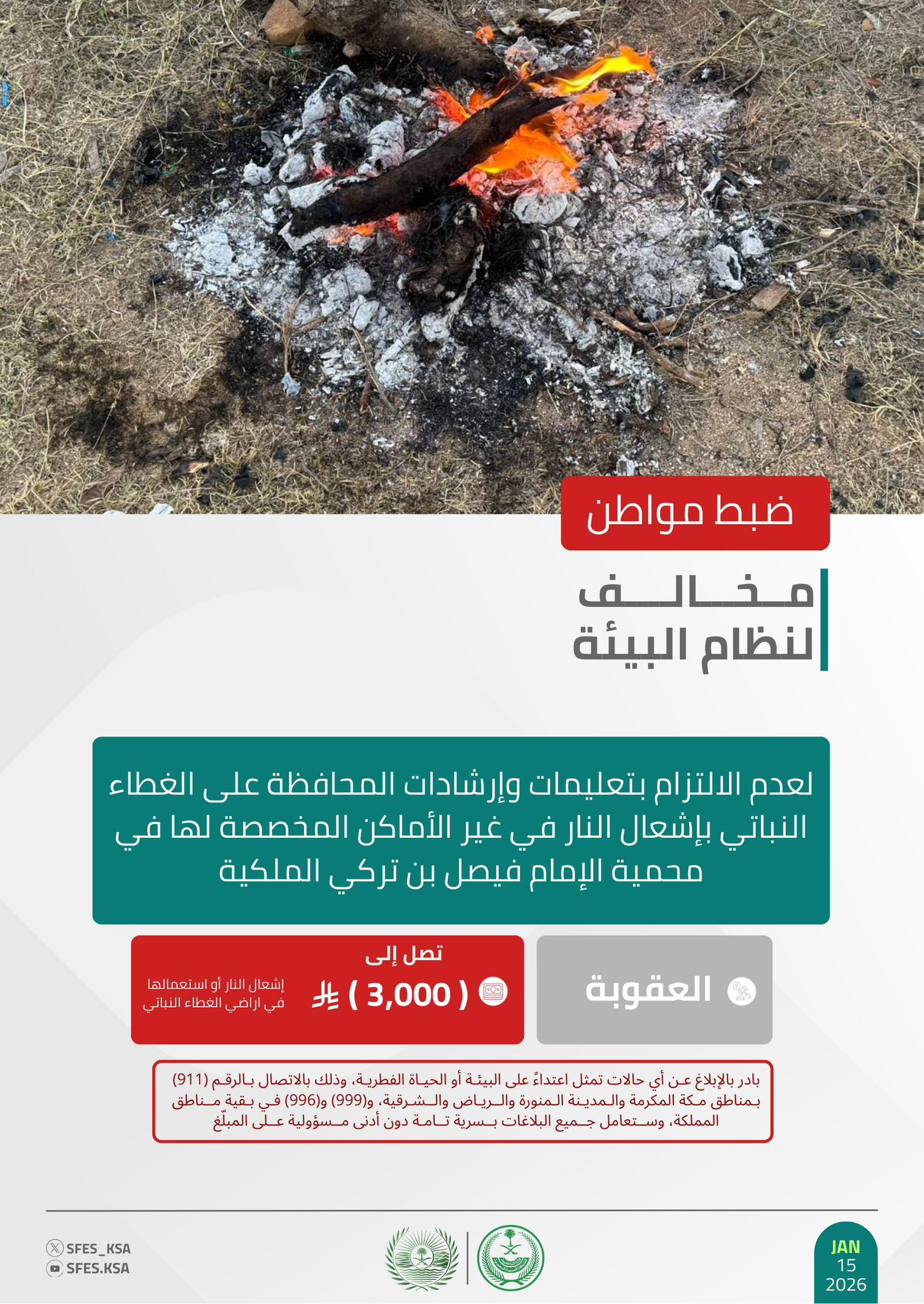 وأكدت القوات أن عقوبة إشعال النار في غير الأماكن المخصصة لها في الغابات والمتنزهات الوطنية غرامة تصل إلى (3,000) ريال، حاثة على الإبلاغ عن أي حالات تمثل اعتداءً على البيئة أو الحياة الفطرية على الرقم (911) بمناطق مكة المكرمة والمدينة المنورة والرياض والشرقية، و (999) و (996) في بقية مناطق المملكة، وستعامل جميع البلاغات بسرية تامة دون أدنى مسؤولية على المبلّغ.