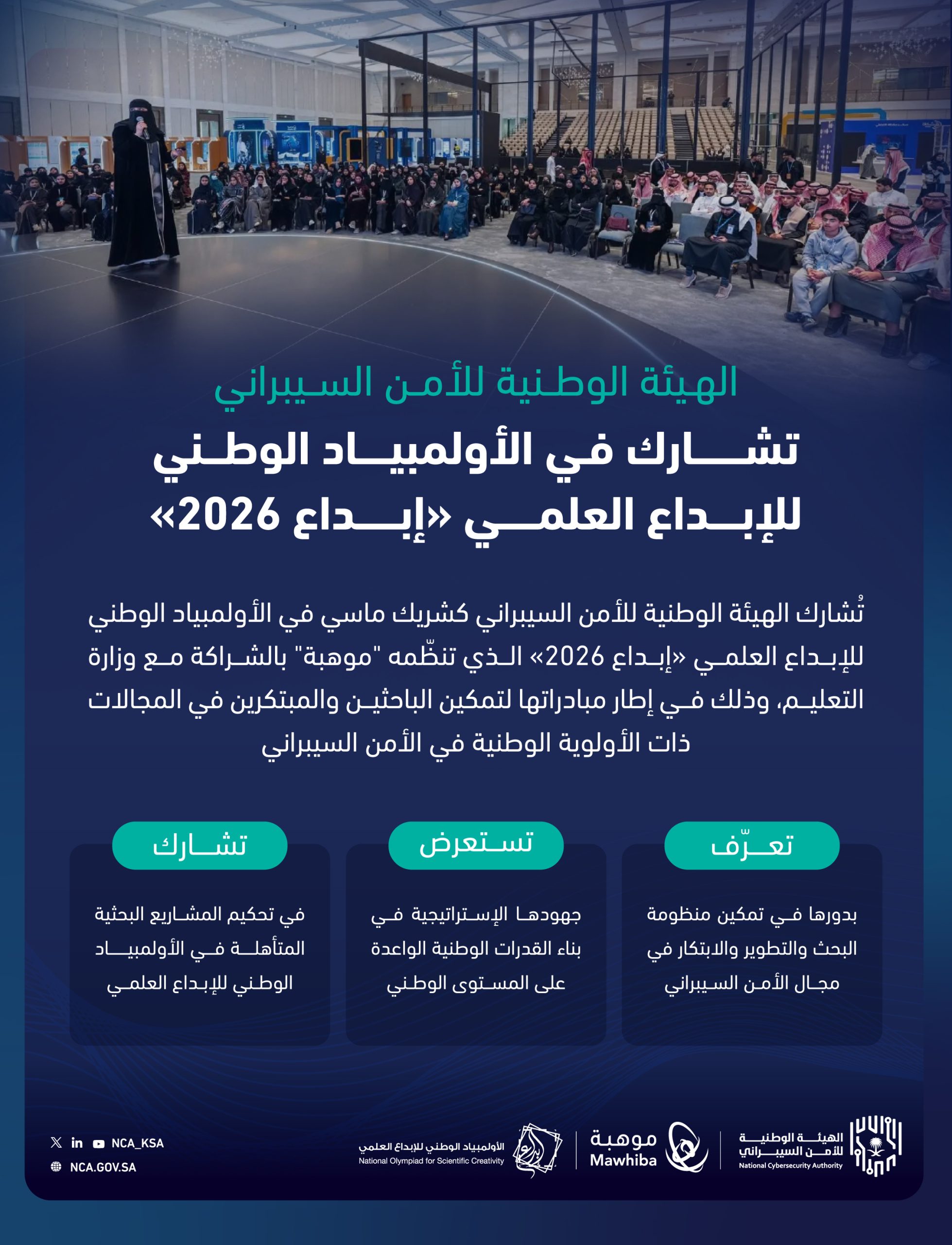 تُشارك الهيئة الوطنية للأمن السيبراني بصفتها شريكًا ماسيًّا في الأولمبياد الوطني للإبداع العلمي (إبداع 2026)، الذي تنظّمه مؤسسة الملك عبدالعزيز ورجاله للموهبة والإبداع (موهبة) بالشراكة مع وزارة التعليم، والهادف إلى اكتشاف المواهب الوطنية، وتنمية الإبداع العلمي لدى الطلبة وإكسابهم المهارات البحثية والابتكارية في مجالات مختلفة، لتمثيل المملكة في المحافل الدولية بمشاريع بحثية متميزة.