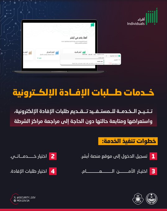 وأوضح الأمن العام أن تنفيذ الخدمة يتم عبر خطوات يسيرة تبدأ بتسجيل الدخول إلى منصة أبشر، ثم التوجه إلى خيار خدماتي، ومنها اختيار الأمن العام، ثم الانتقال إلى خدمة طلبات الإفادة. ويأتي هذا التحديث التقني ضمن سعي وزارة الداخلية المستمر لتطوير الخدمات الإلكترونية ورفع كفاءة التعاملات الحكومية تماشياً مع رؤية المملكة في التحول الرقمي الشامل.