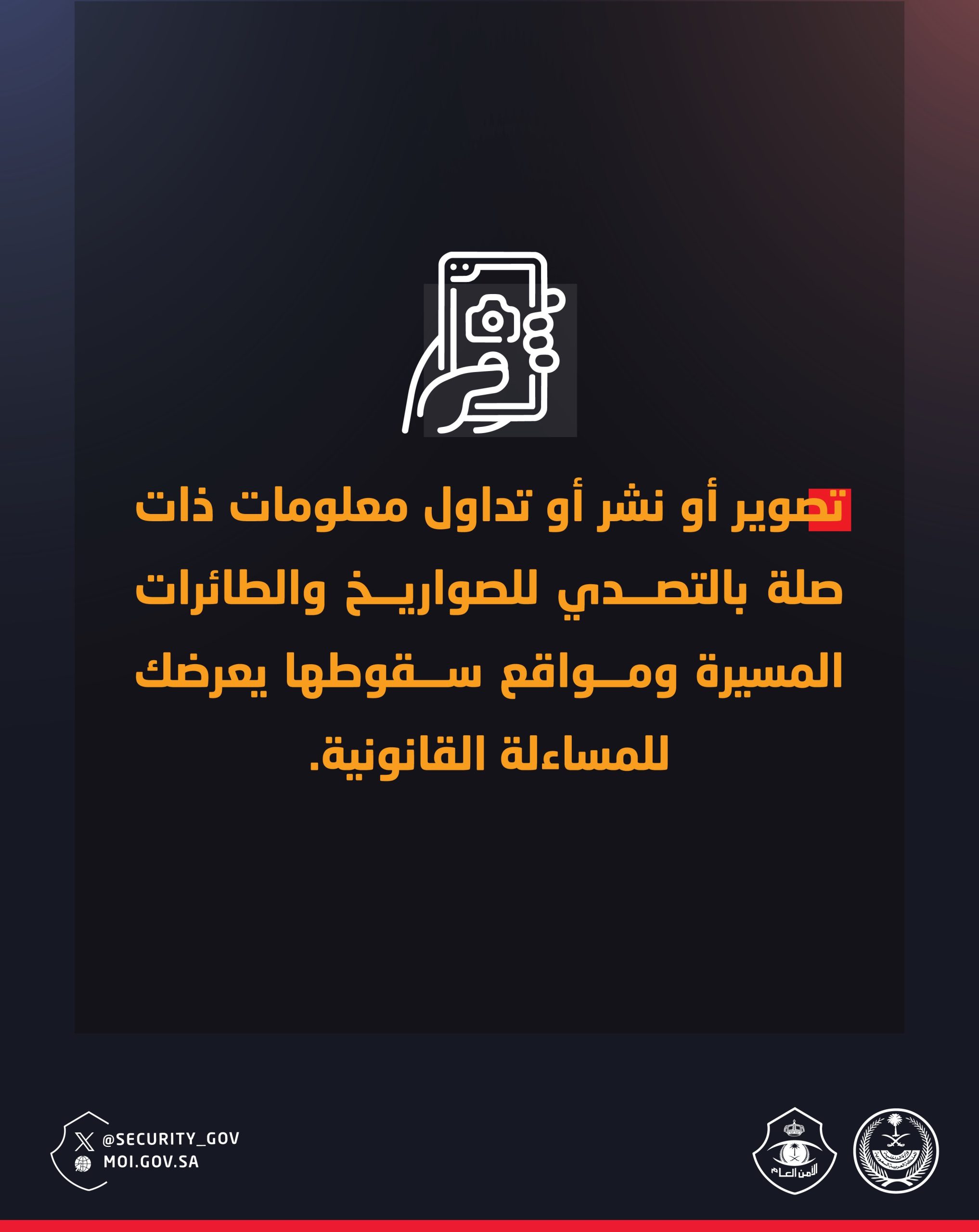 أصدر الأمن العام تحذيرًا يؤكد فيه أن تصوير أو نشر أو تداول أي معلومات تتعلق بعمليات التصدي للصواريخ والطائرات المسيّرة، أو مواقع سقوطها، يُعد مخالفة قانونية قد تُعرّض مرتكبيها للمساءلة.