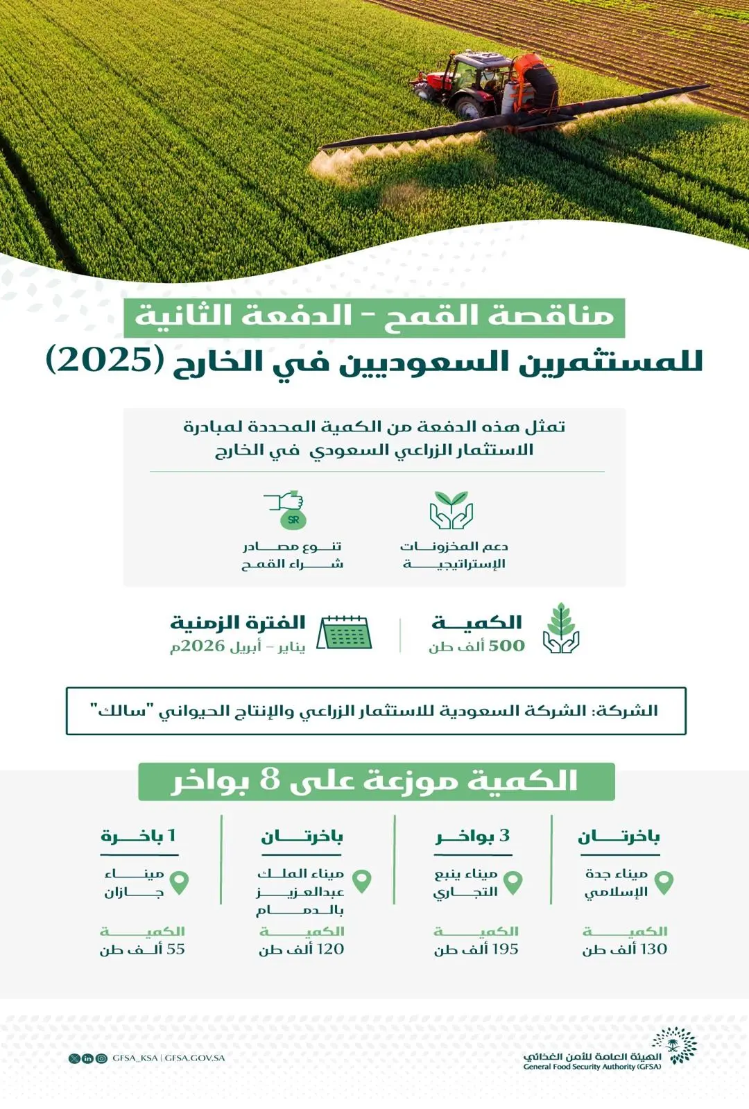 وأوضح معالي رئيس الهيئة المهندس أحمد بن عبدالعزيز الفارس، أن الدفعة الثانية التي تم ترسيتها اليوم بلغت (500) ألف طن قمح، موزعة على (8) بواخر، بواقع (2) باخرة لميناء جدة الإسلامي بكمية (130) ألف طن، و (3) بواخر لميناء ينبع التجاري بكمية (195) ألف طن، (2) باخرة لميناء الملك عبدالعزيز بالدمام بكمية (120) ألف طن، و(1) باخرة لميناء جازان بكمية (55) ألف طن، وذلك للتوريد خلال الفترة (يناير – أبريل 2026 م)، وبمتوسط سعر (268.12) دولارًا للطن.
