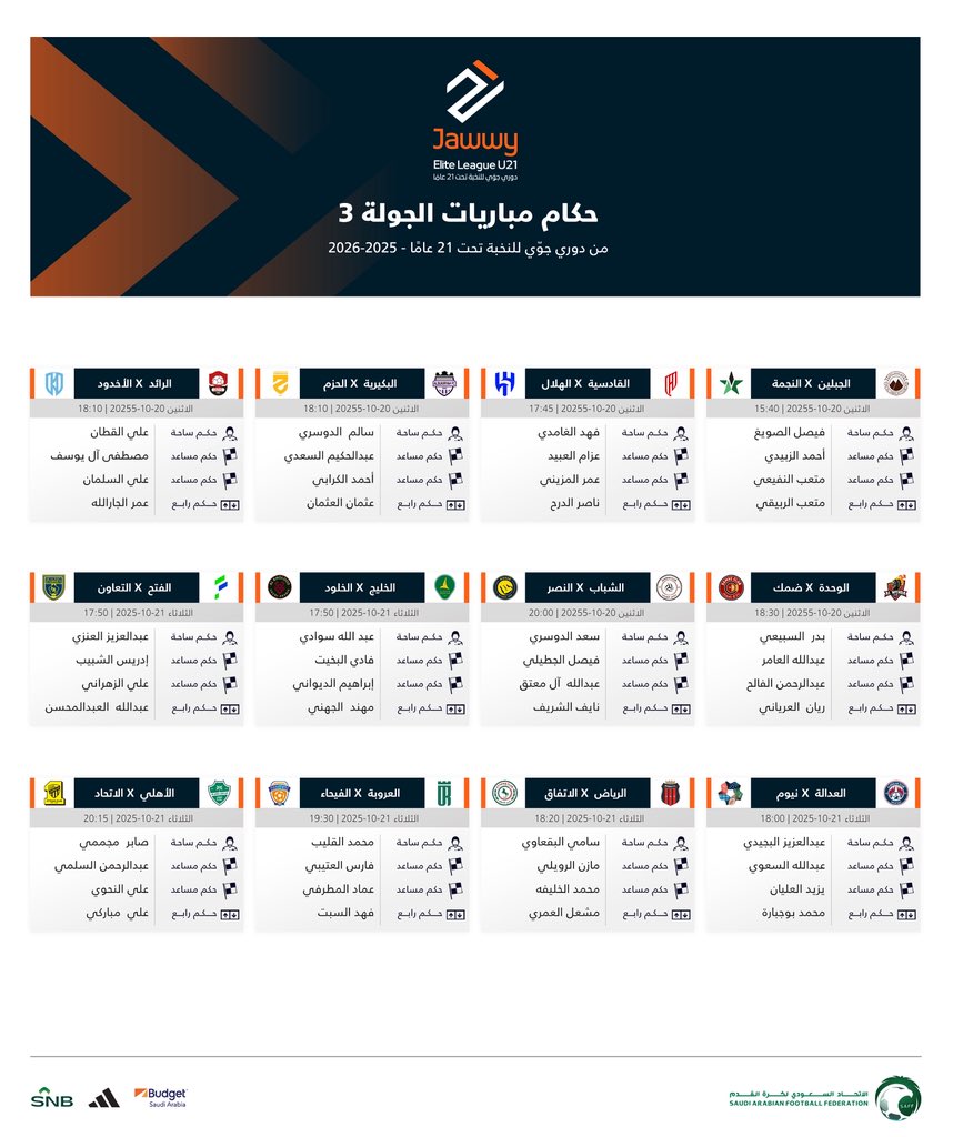 صراحة – الرياض: أعلنت لجنة الحكام في الاتحاد السعودي لكرة القدم عن حكام مباريات الجولة الثالثة من دوري “جوي” الممتاز تحت 21 عامًا للموسم الرياضي 2025-2026، والتي ستُقام يومي 20 و21 أكتوبر الجاري.