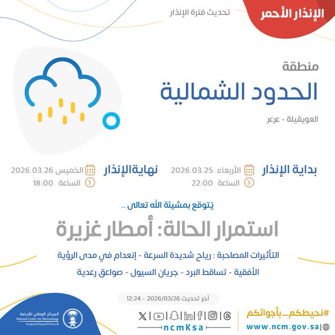 الإنذار الأحمر في #الحدود_الشمالية.. توقعات باستمرار الأمطار الغزيرة والصواعق الرعدية.