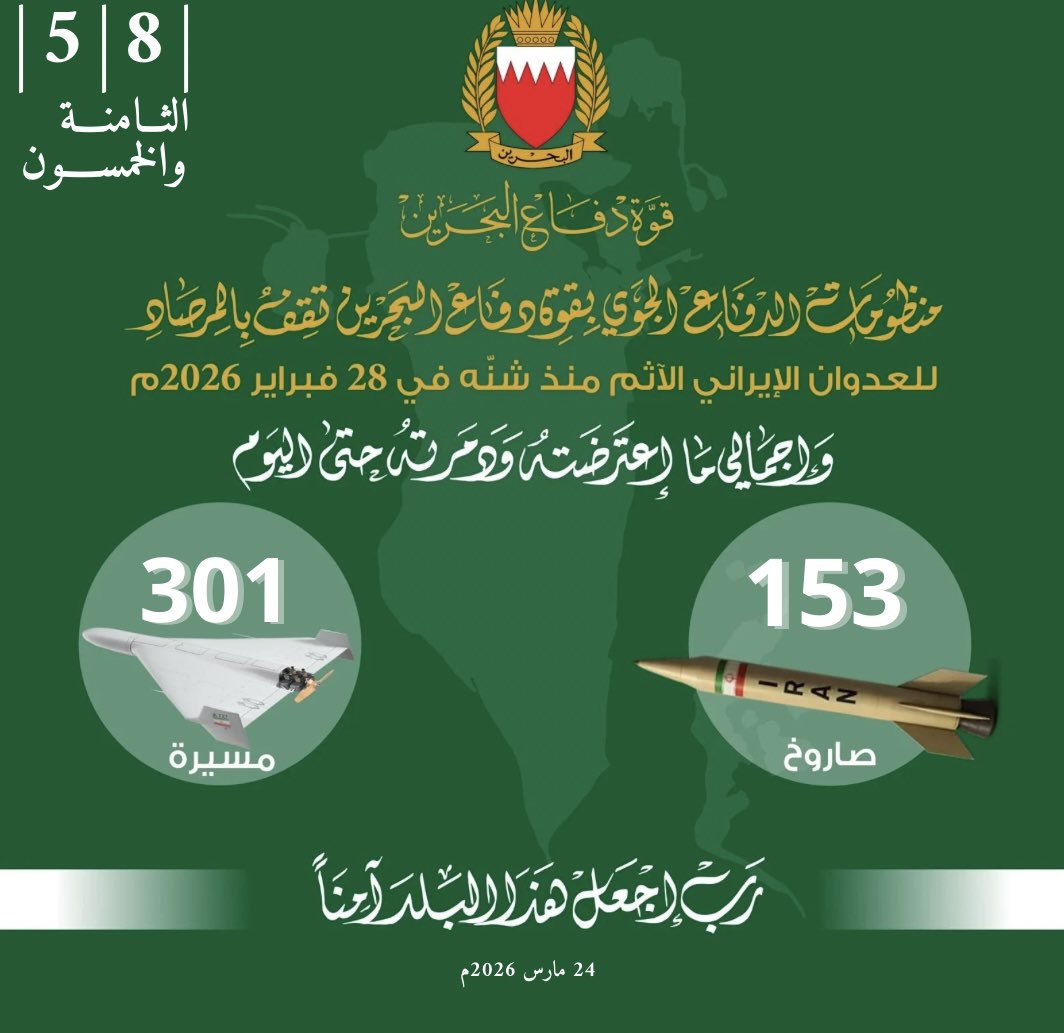أعلنت القيادة العامة لقوة دفاع البحرين أن منظومات الدفاع الجوي تصدت اليوم لهجمات إيرانية، حيث تم اعتراض وتدمير 6 صواريخ و19 طائرة مسيّرة استهدفت أراضي مملكة البحرين.