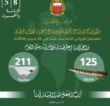 أعلنت القيادة العامة لقوة دفاع البحرين أن منظومات الدفاع الجوي بقوة دفاع البحرين، بفضلٍ من الله، ثم بيقظة رجالها، مستمرة في مواجهة موجات تتابعية من الاعتداءات الإيرانية الإرهابية الآثمة، حيث تم منذ بدء الاعتداء الغاشم اعتراض وتدمير 125 صاروخًا و 211 طائرة مسيرة استهدفت مملكة البحرين.