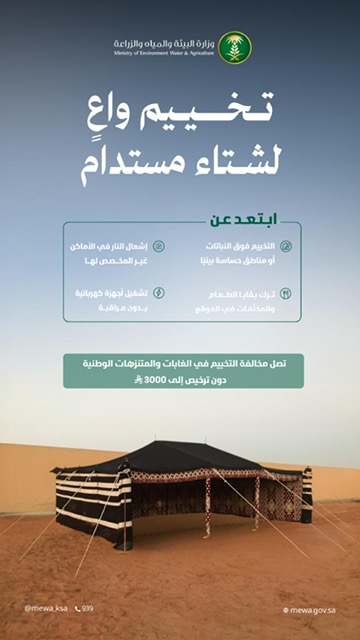 تواصل وزارة البيئة والمياه والزراعة تسخير جهودها الرامية إلى تعزيز الوعي بالممارسات السليمة التي تدعم سلامة المخيمين والمحافظة على الموارد الطبيعية، لما يشهده موسم الشتاء من ازدياد ملحوظ في نشاطات التخييم بالمناطق الطبيعية، حيث يجد الأفراد مساحة للاستمتاع بأجواء الشتاء واستكشاف تنوّع البيئة المحلية.