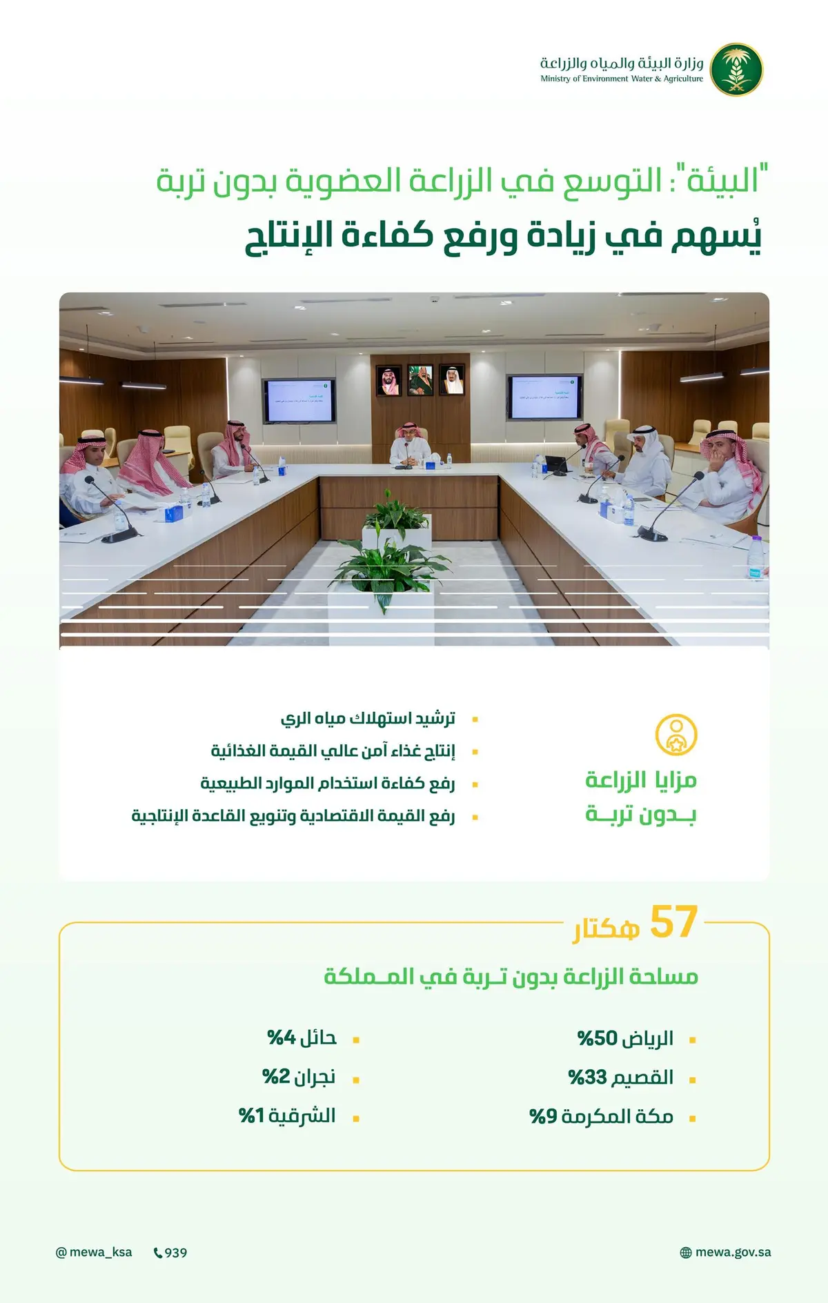 صراحة – الرياض: أكّدت وزارة البيئة والمياه والزراعة، أهمية نظم الزراعة بدون تربة والتوسّع فيها؛ للتغلُّب على الظروف البيئية، والتقلبات المناخية غير المناسبة للإنتاج الزراعي، والإسهام في رفع كفاءته، مبينة أن مساحات الزراعة بدون تربة في المملكة، بلغت نحو (57) هكتارًا، لمحاصيل متنوعة من الخضار والفواكه، في عدد من المناطق.