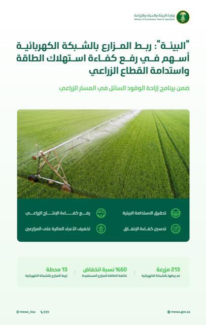 أكملت وزارة البيئة والمياه والزراعة، ربط 213 مزرعة بالشبكة الكهربائية، ضمن أعمال برنامج إزاحة الوقود السائل في المسار الزراعي، وذلك في إطار جهودها لتحقيق الاستدامة البيئية، ورفع كفاءة استهلاك الطاقة؛ مما أسهم في تخفيض تكلفة الطاقة للمزارع المستفيدة بنسبة 60%، وتحسين كفاءة الإنفاق، والجدوى الاقتصادية للمزارع، تماشيًا مع توجهات التحول نحو الطاقة النظيفة، وفقًا لمستهدفات رؤية المملكة 2030.